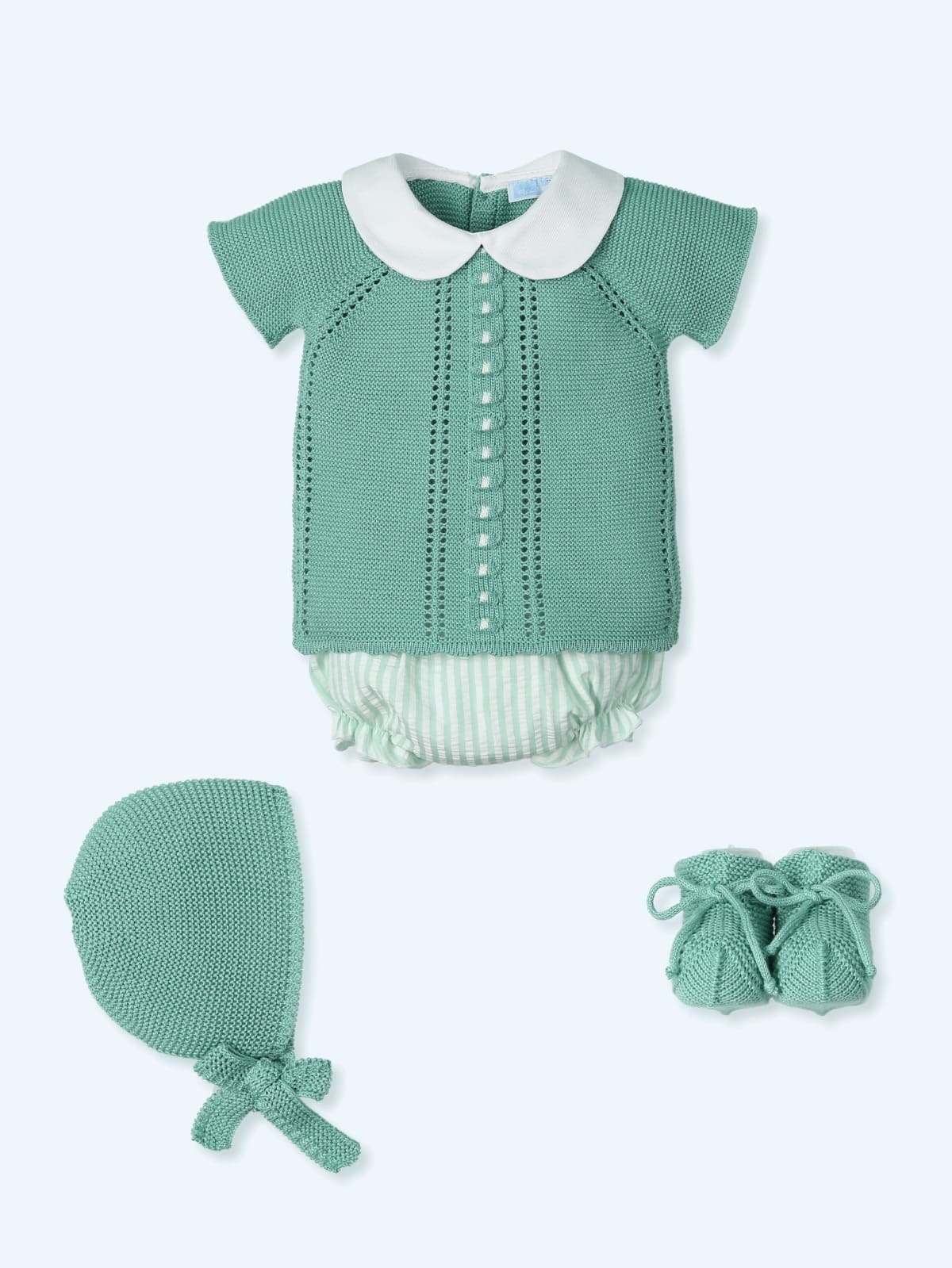 Conjunto de hilo perlé en color verde combinado con blanco.