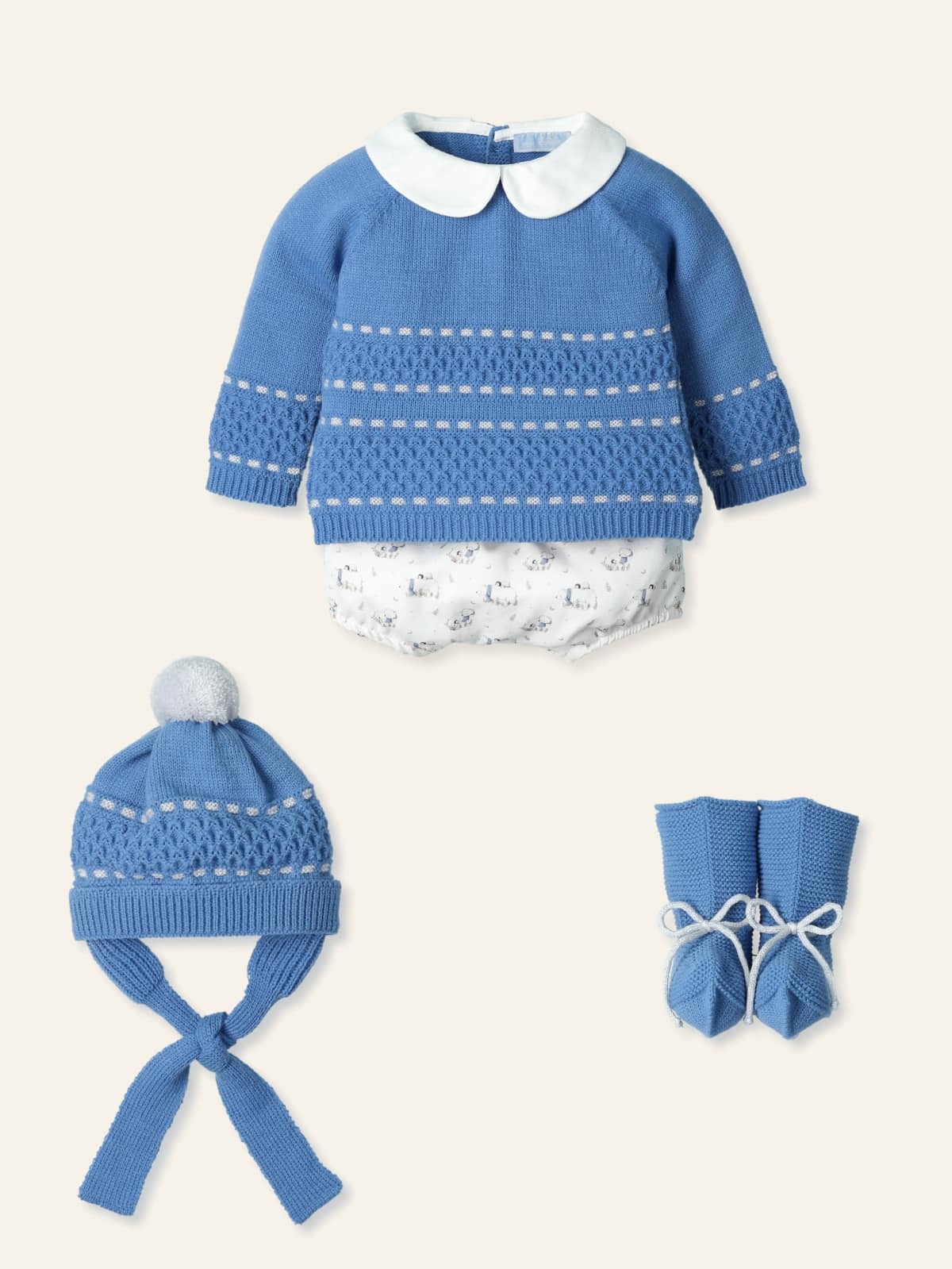 Conjunto 4 piezas con tejido Dralón en color azul Francia y blanco. Jersey con detalles bordados en gris clarito y cuello bebé en color blanco.