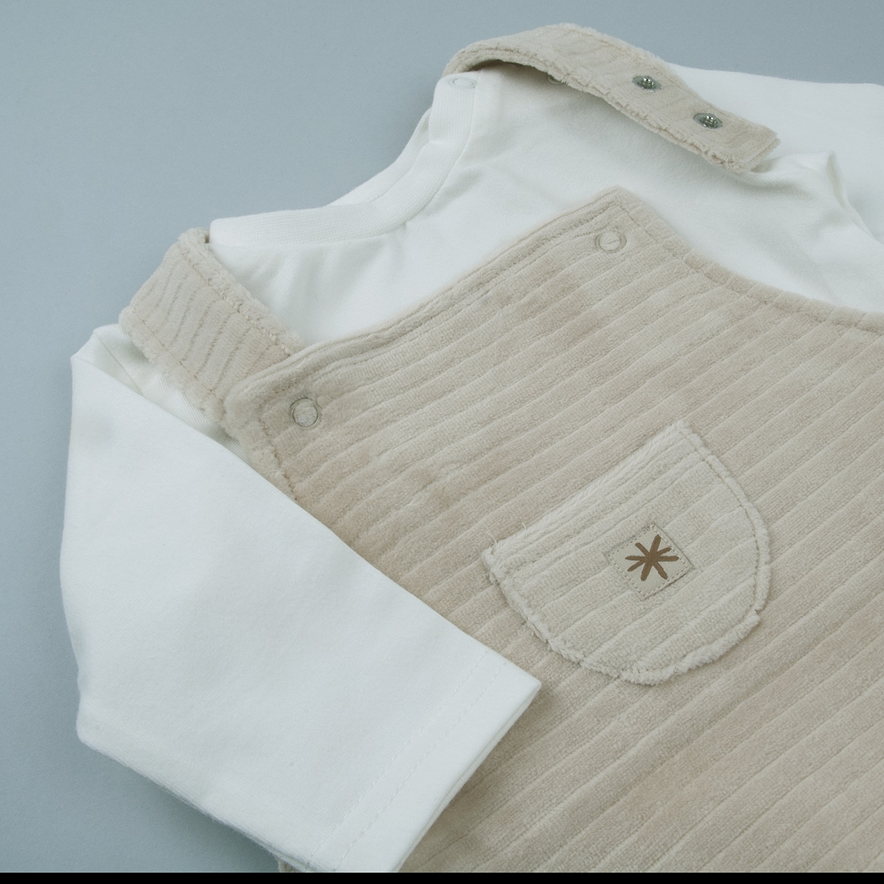 Peto tundosado de color beige con bolsillo delantero y tejido acanalado. Apertura en los tirantes y la parte inferior.