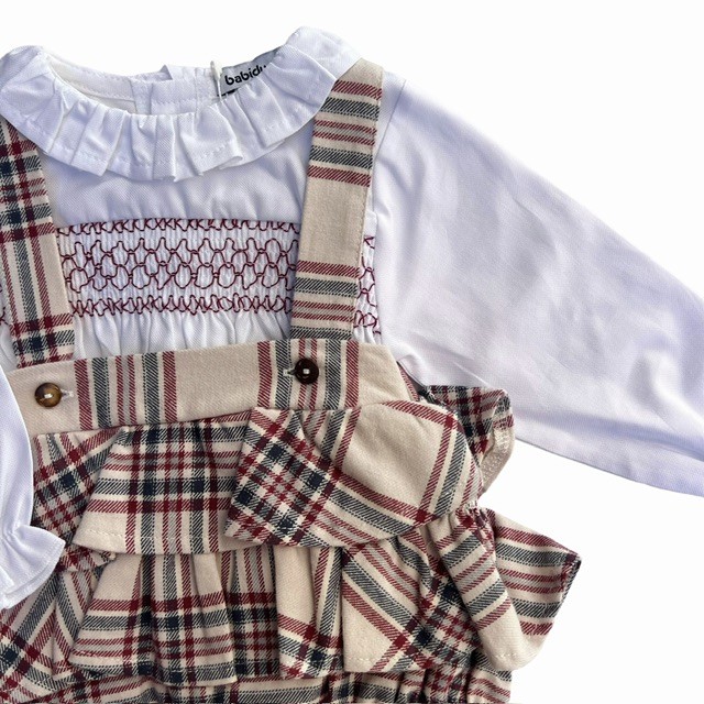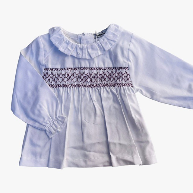 Camisa 100% algodón en color blanco con nido de abeja en color granate. Detalle volante en el cuello.