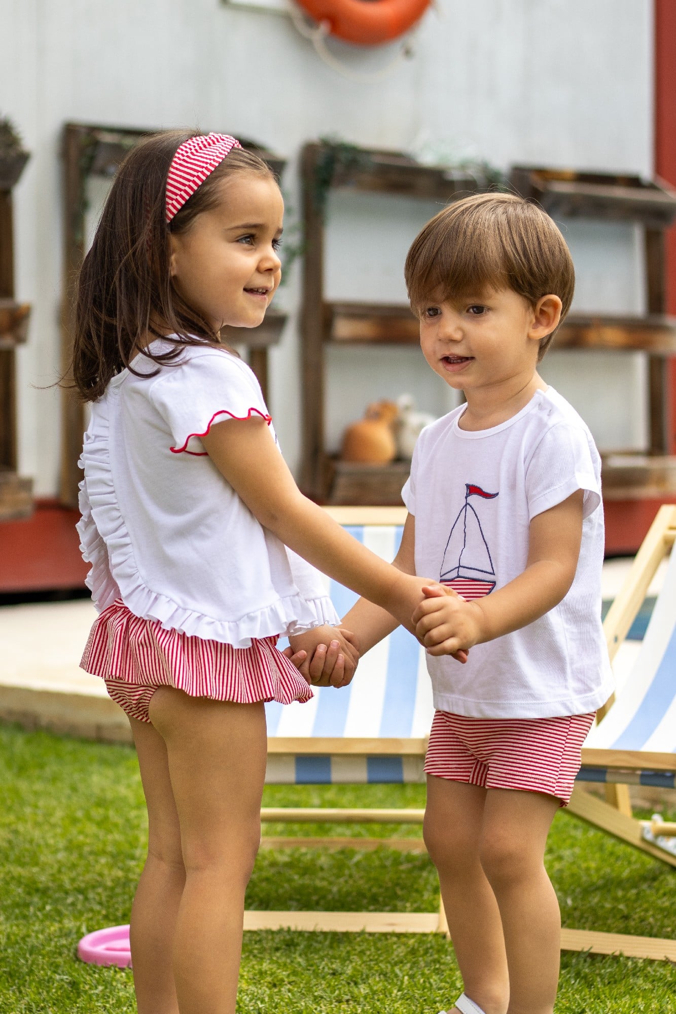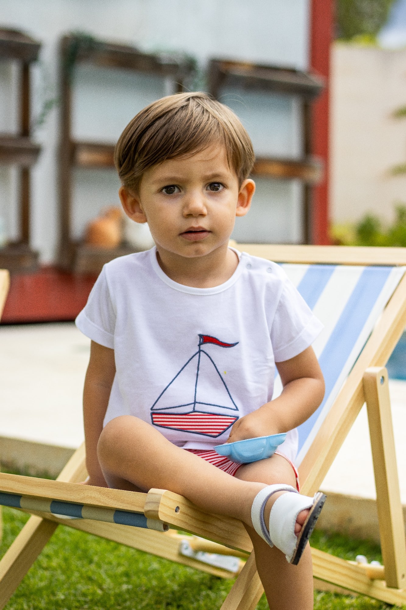 Camiseta de color blanco con estampado barquito en color rojo. Apertura en hombro con corchetes automáticos.