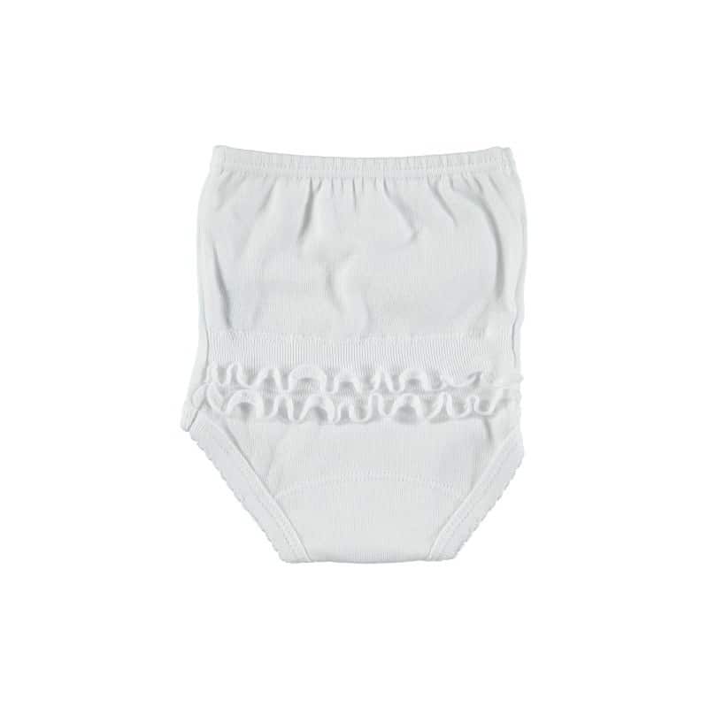 Cubrepañales de punto con volante trasero.COMPOSICIÓN: 100% ALGODÓN.CUIDADOS: Lavar a máquina – agua fría (30 ° max).