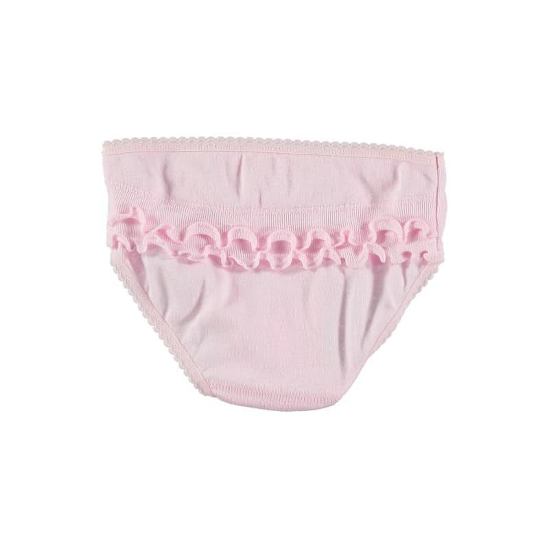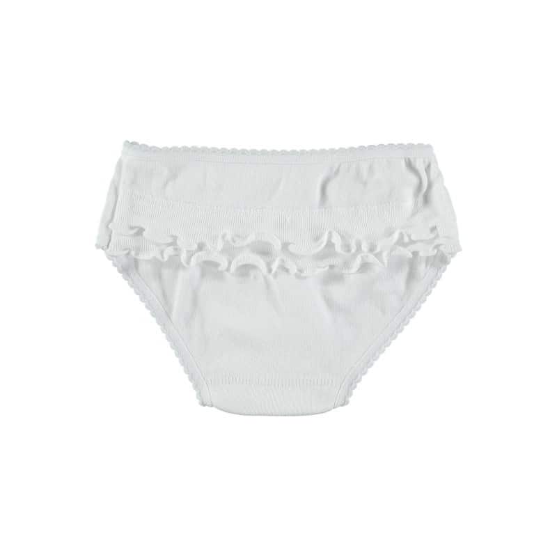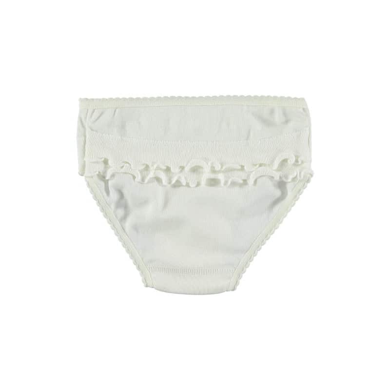 Braguita niña de punto con volante trasero. Disponible de 0 a 6 años.COMPOSICIÓN: 100% ALGODÓN.CUIDADOS: Lavar a máquina – agua fría (30 ° max).