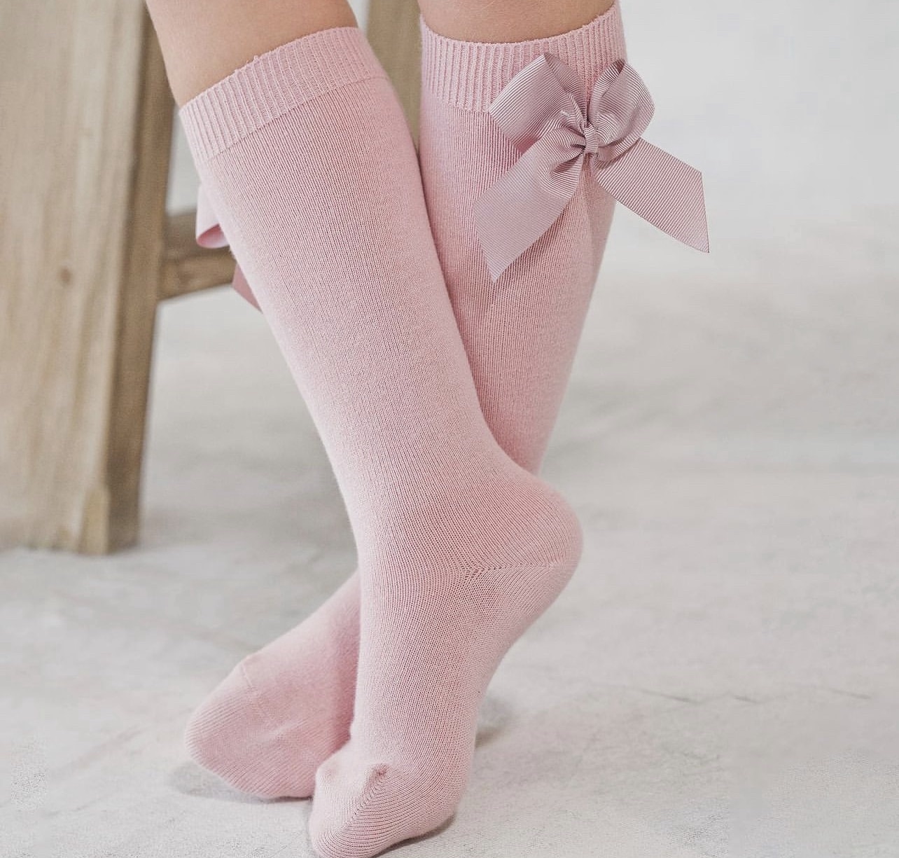 Calcetines de algodón, altos por debajo de la rodilla, en punto liso, con detalle de lazos de gros-grain a tono en el lateral. Disponible en una gran variedad de colores y tallas.
