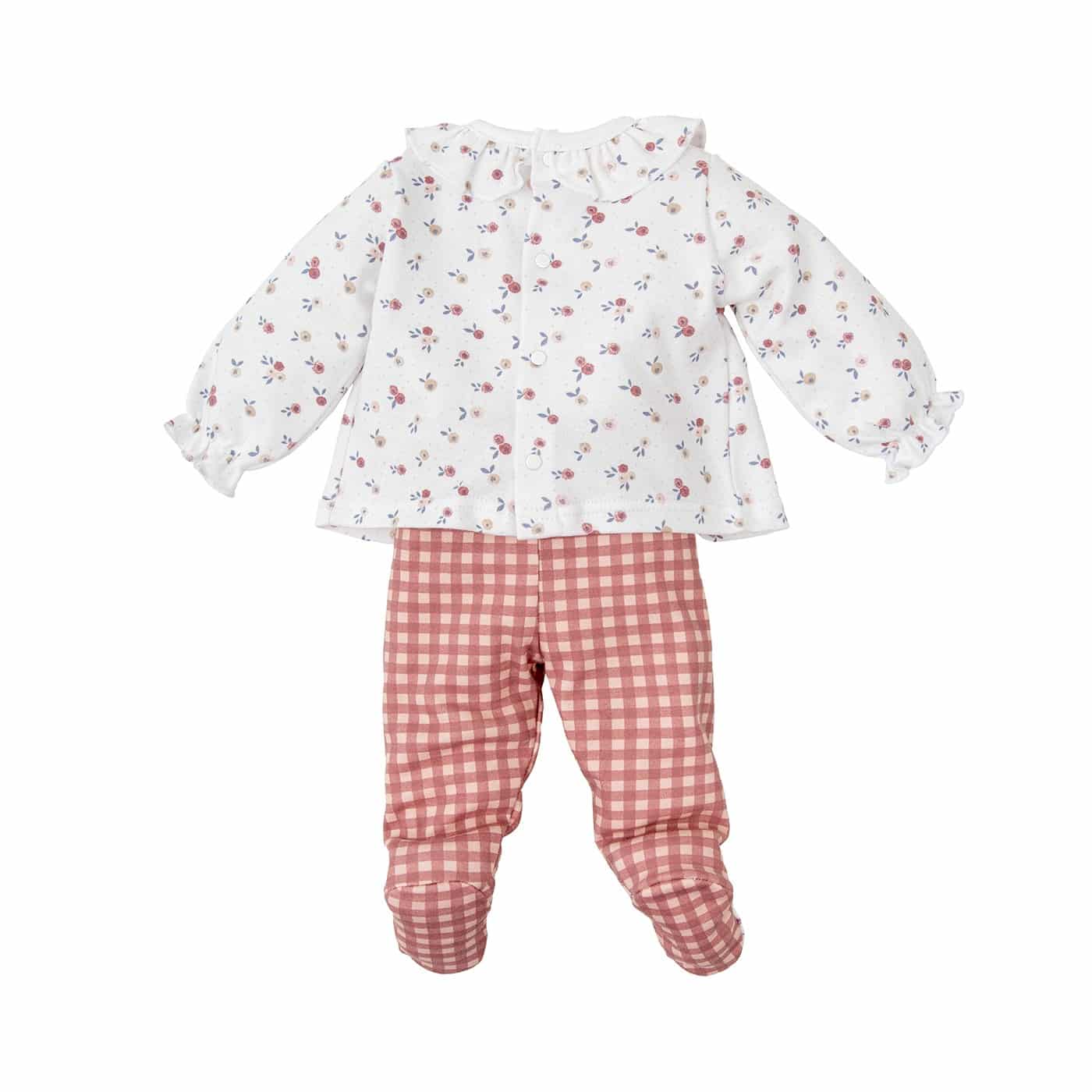 Conjunto 100% algodón de color blanco con estampado de flores y cuadros en color borgoña. Detalle cuello volante y dos botones de madera decorativos en el pecho. Apertura completa en la parte trasera con corchetes automáticos