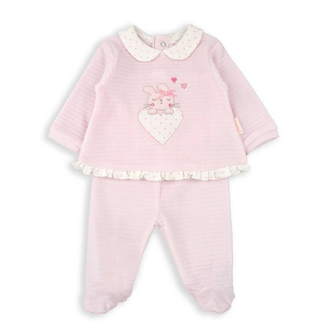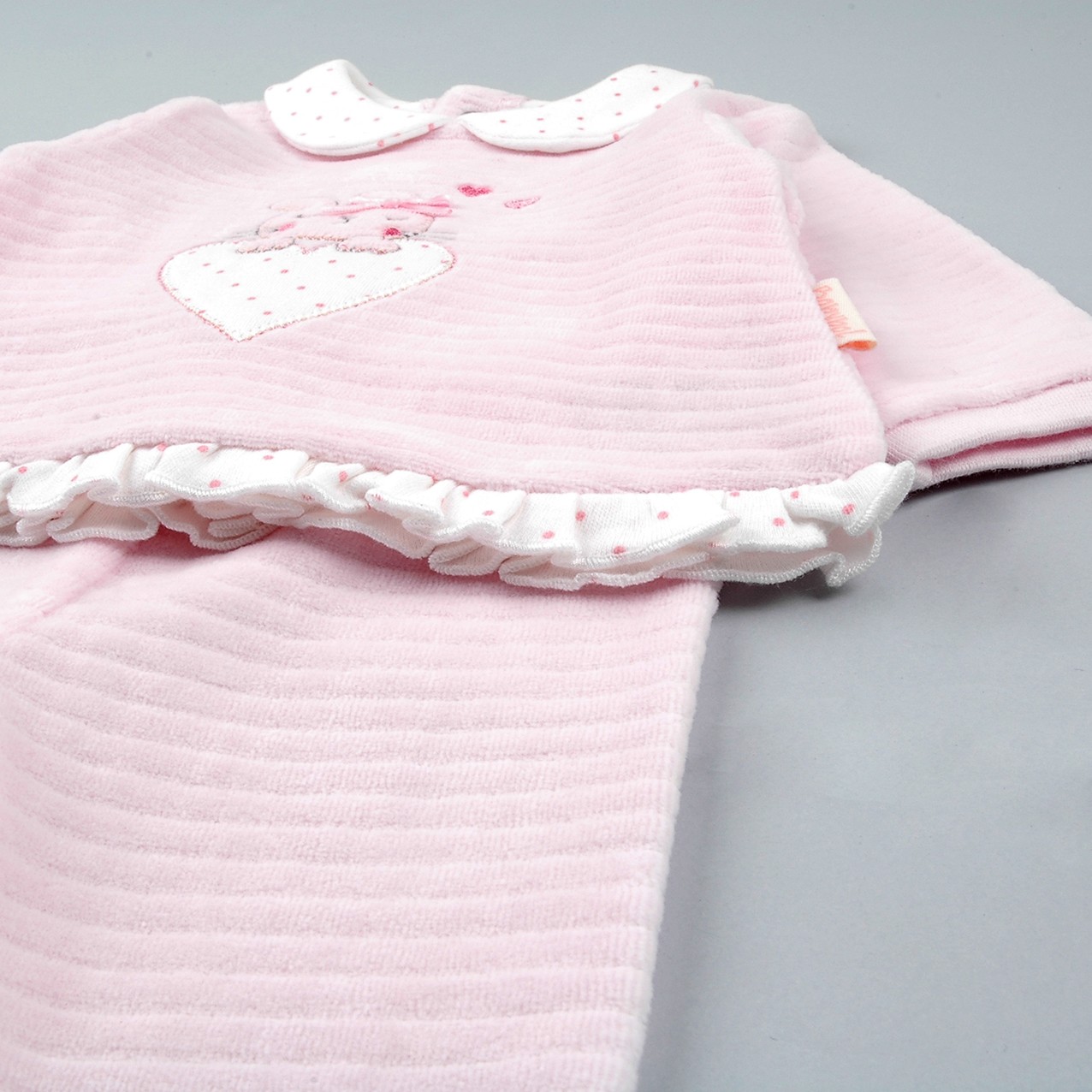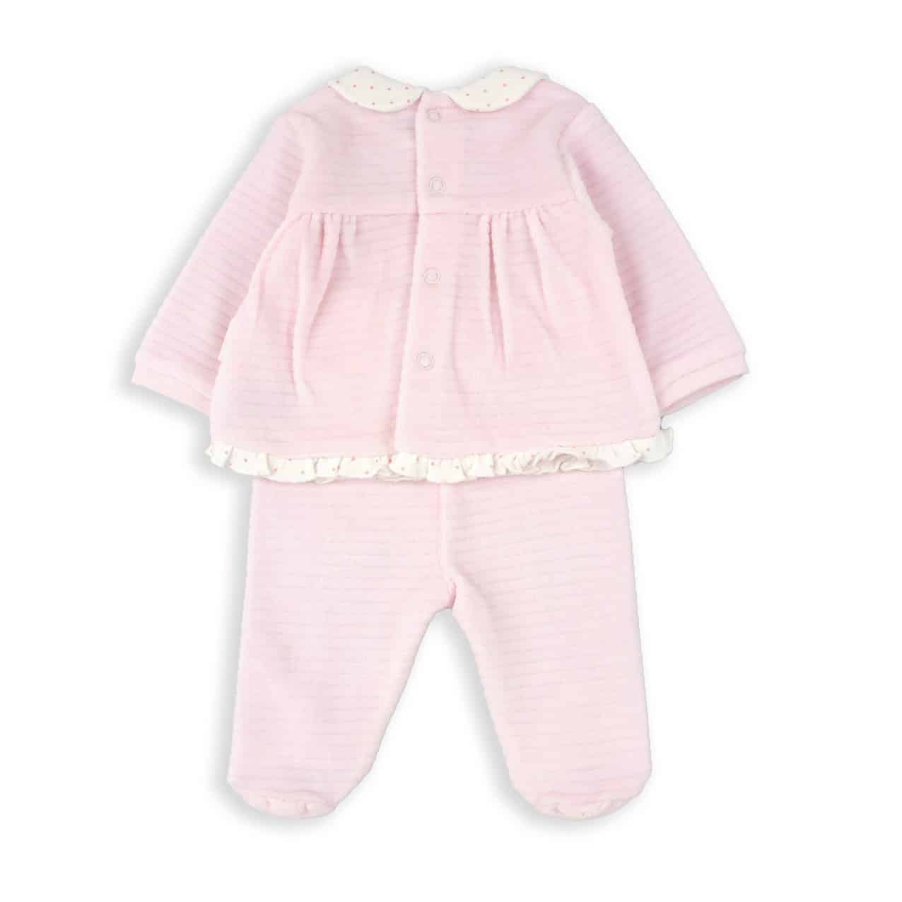 Conjunto 100% algodón tundosado en color rosa y blanco. Detalle cuello bebé y bordados.