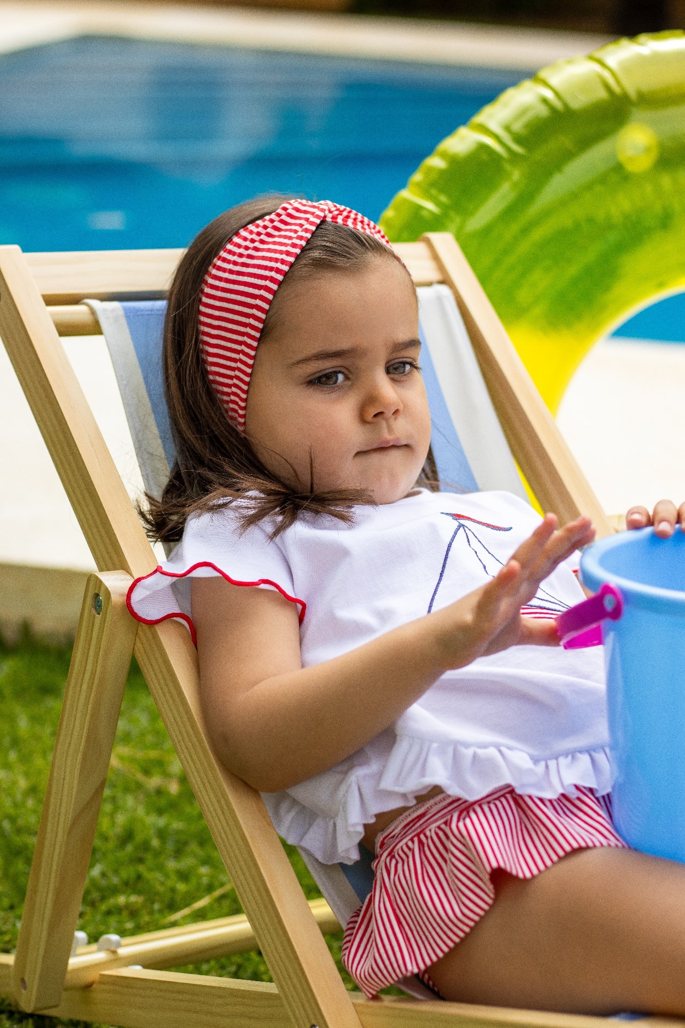 Camiseta de color blanco con estampado barquito en color rojo. Detalle volantes y apertura en la espalda.