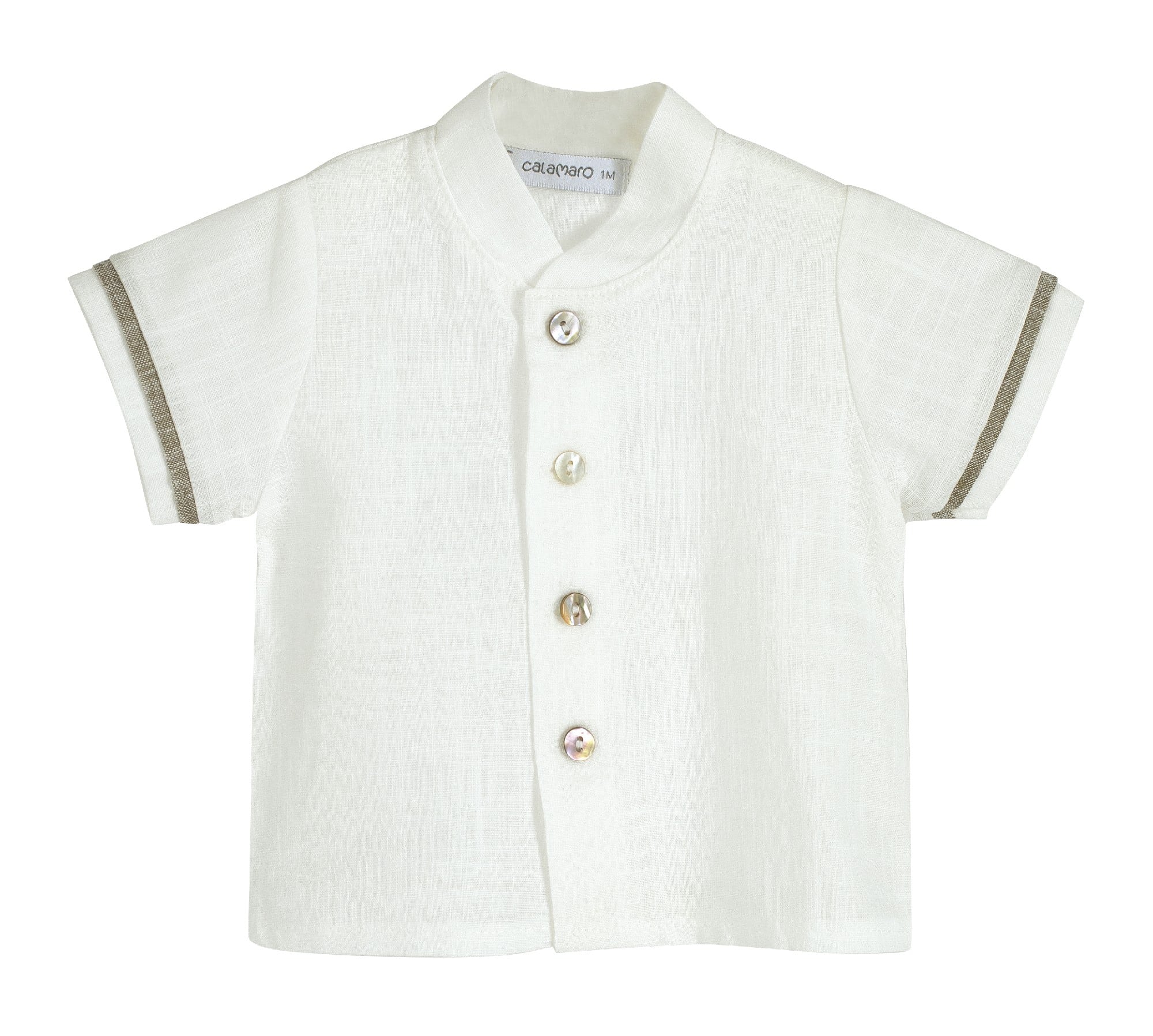 Camisa con cuello mao y detalles en las mangas. Apertura en la parte delantera.