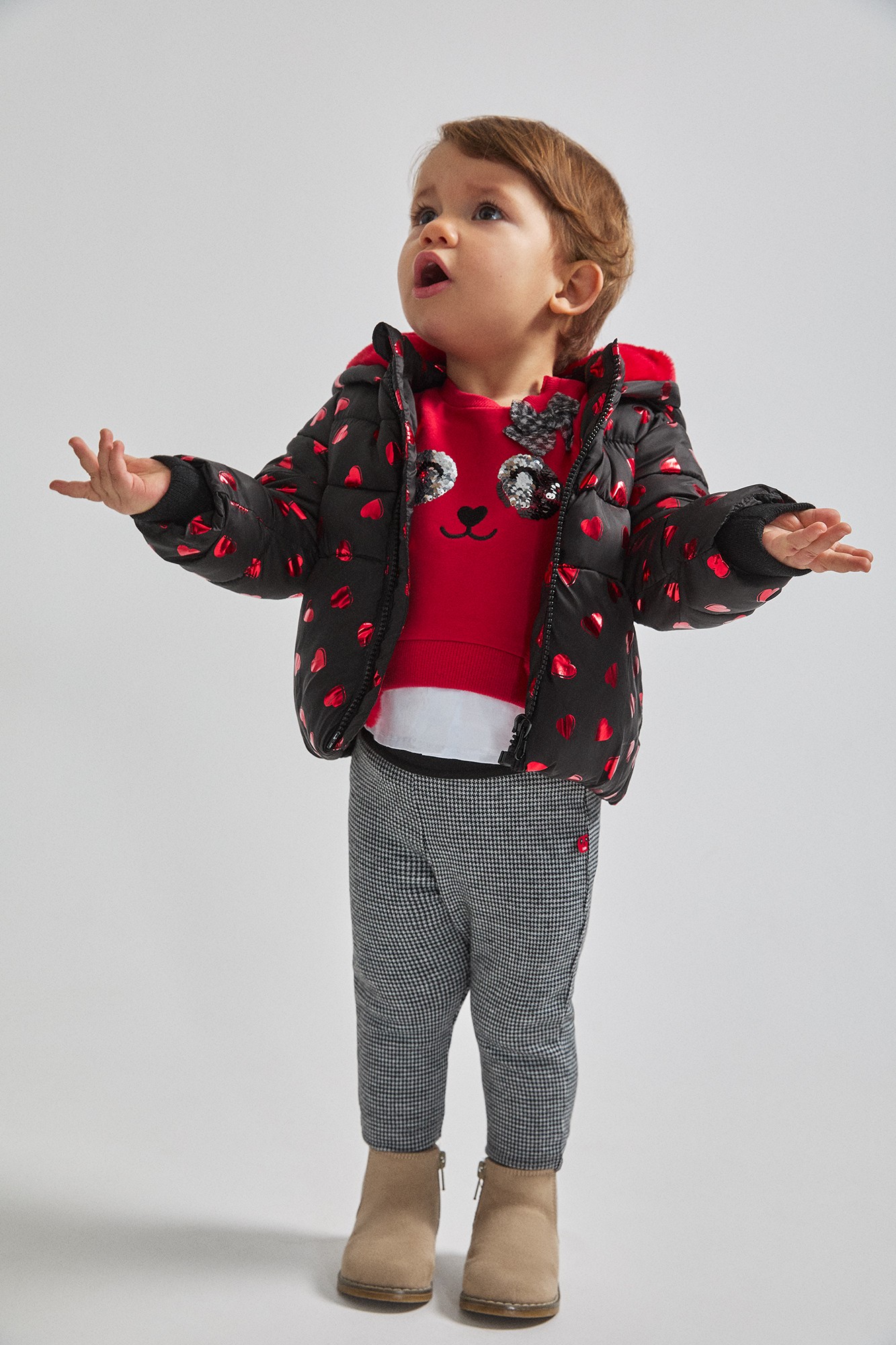 Sudadera 100% algodón con interior afelpado de color rojo y panda bordado en el pecho. Detalle camisa simulada en color blanco.
