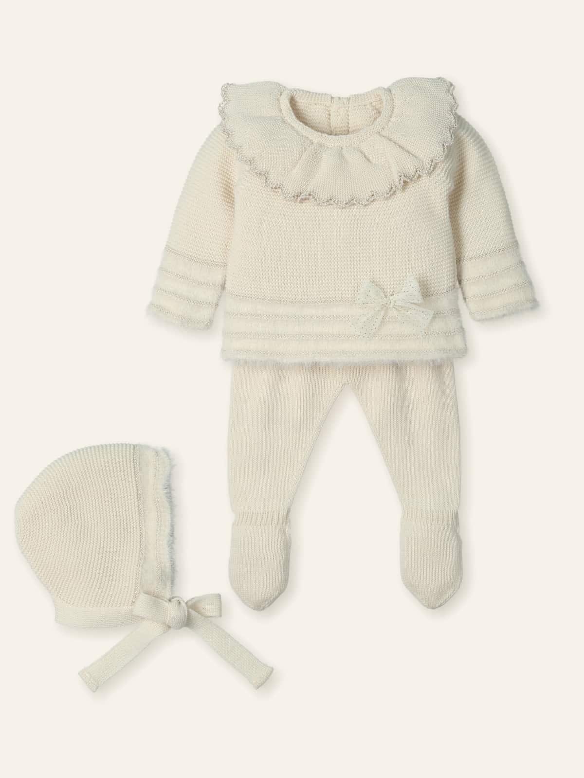 Conjunto Dralón 3 piezas en color natural combinado con hilo dorado. Detalle cuello volante y listones en dorado.