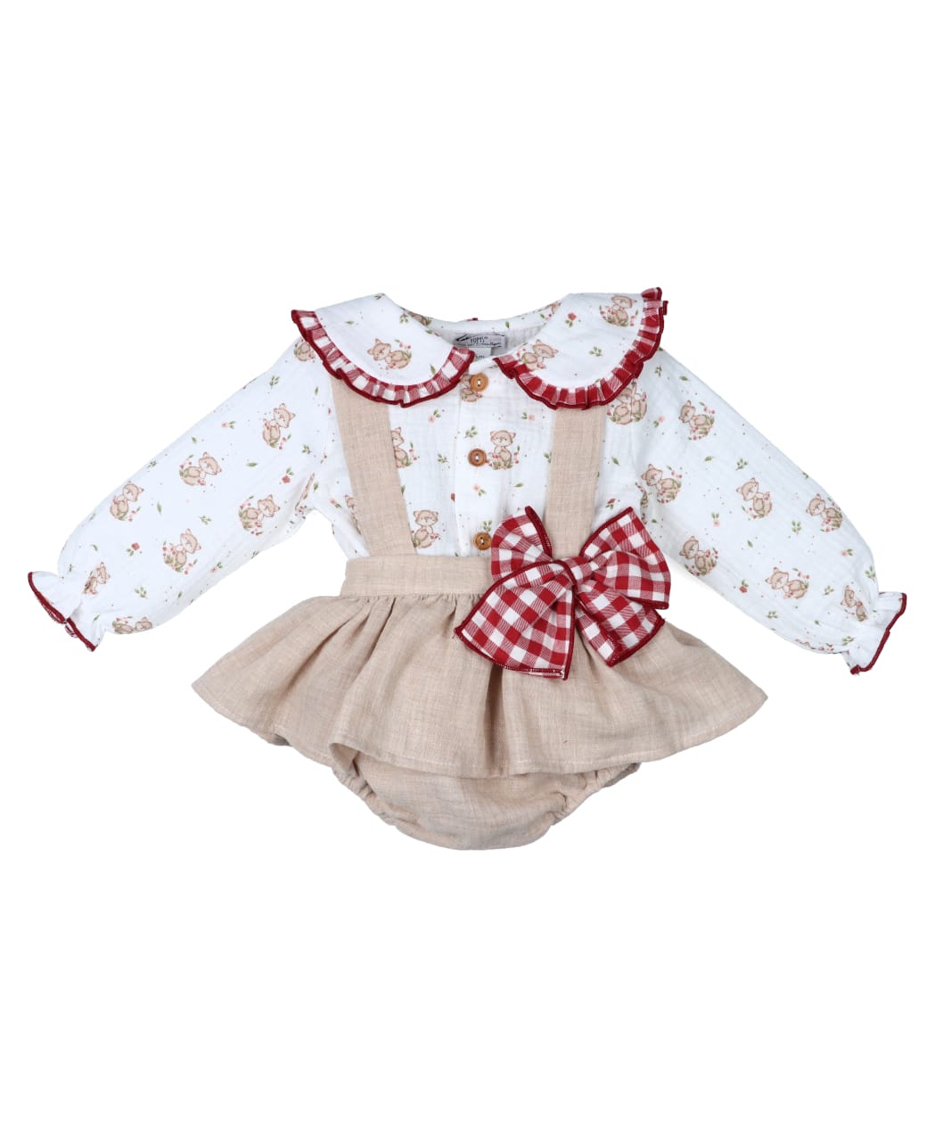 Pichi tirantes de color arena con faldita superpuesta. Lacito decorativo con estampado de cuadros en rojo.