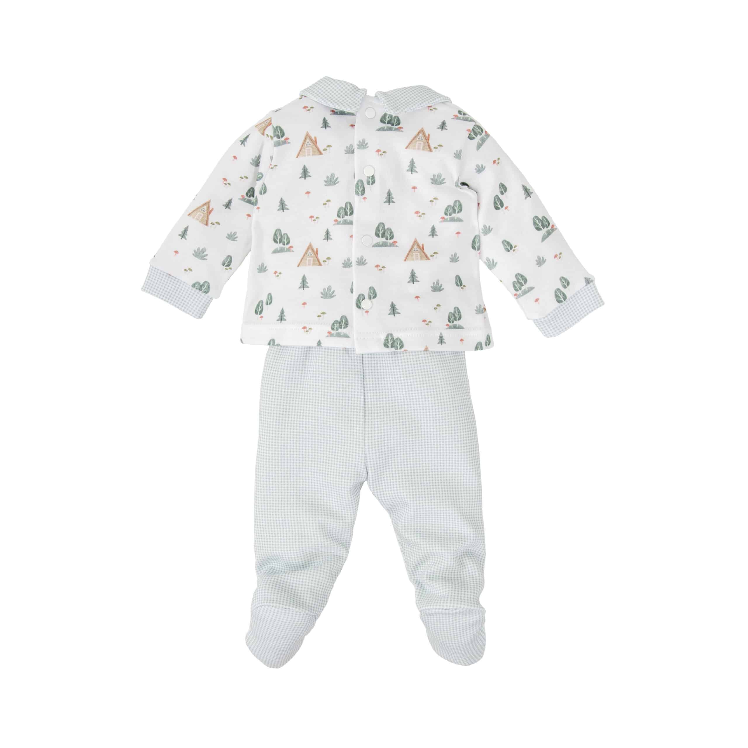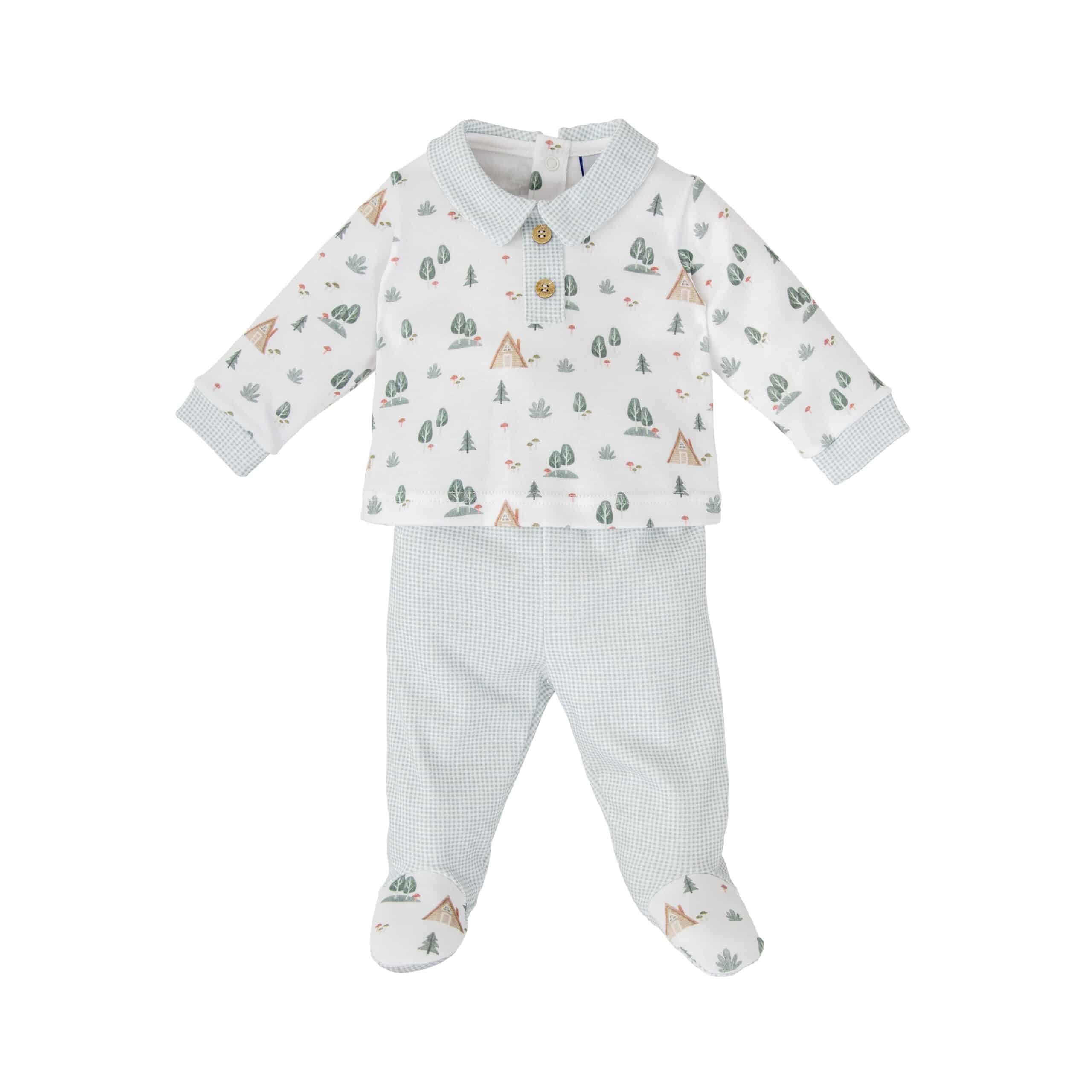 Camiseta de color blanco y azul celeste con estampado de pinos. Cuello bebe de cuadros vichy en azul celeste y blanco.