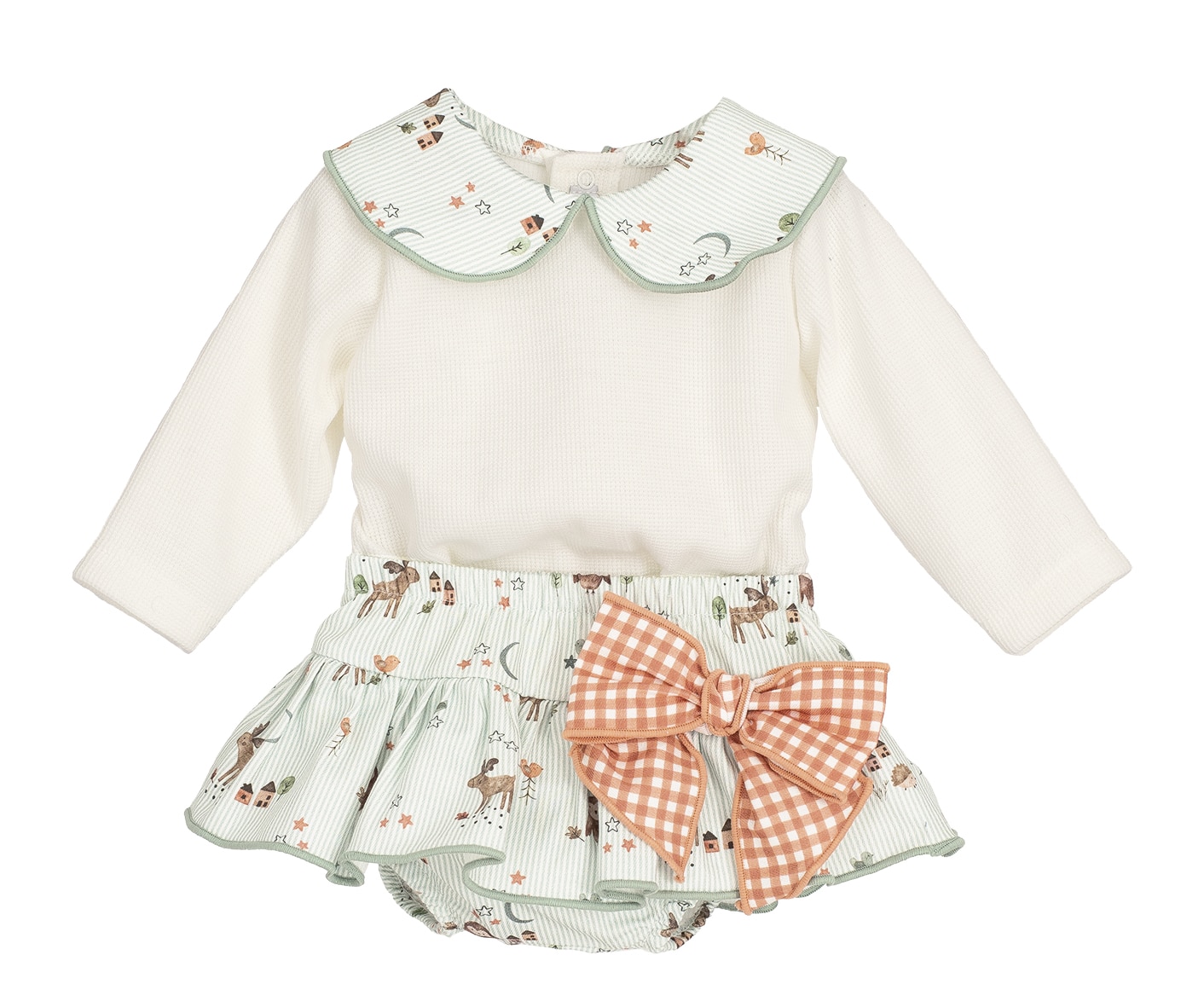 Ranita con volantes estampada en color verde mint con estampado de renos y lazo estampado vichy en naranja.