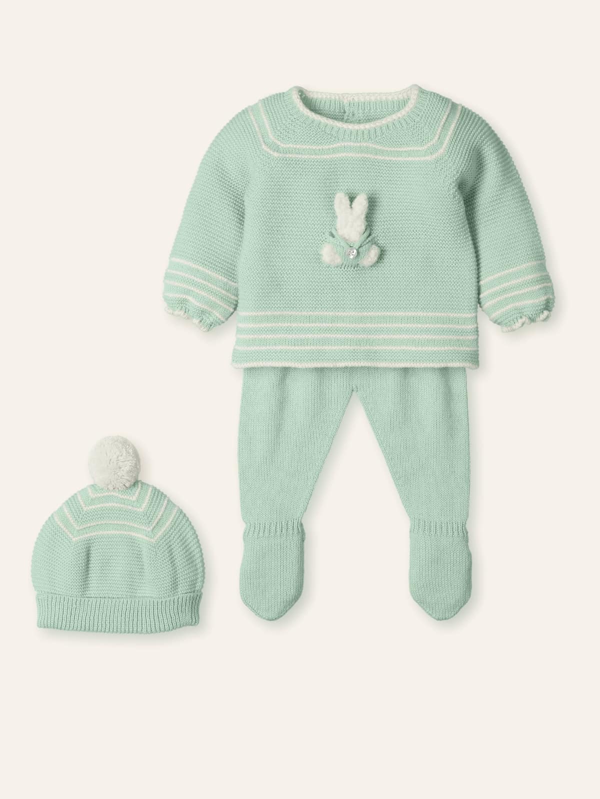 Conjunto Dralón 3 piezas en color verde menta combinado con beige. Detalle conejito en el pecho que se puede poner y quitar.