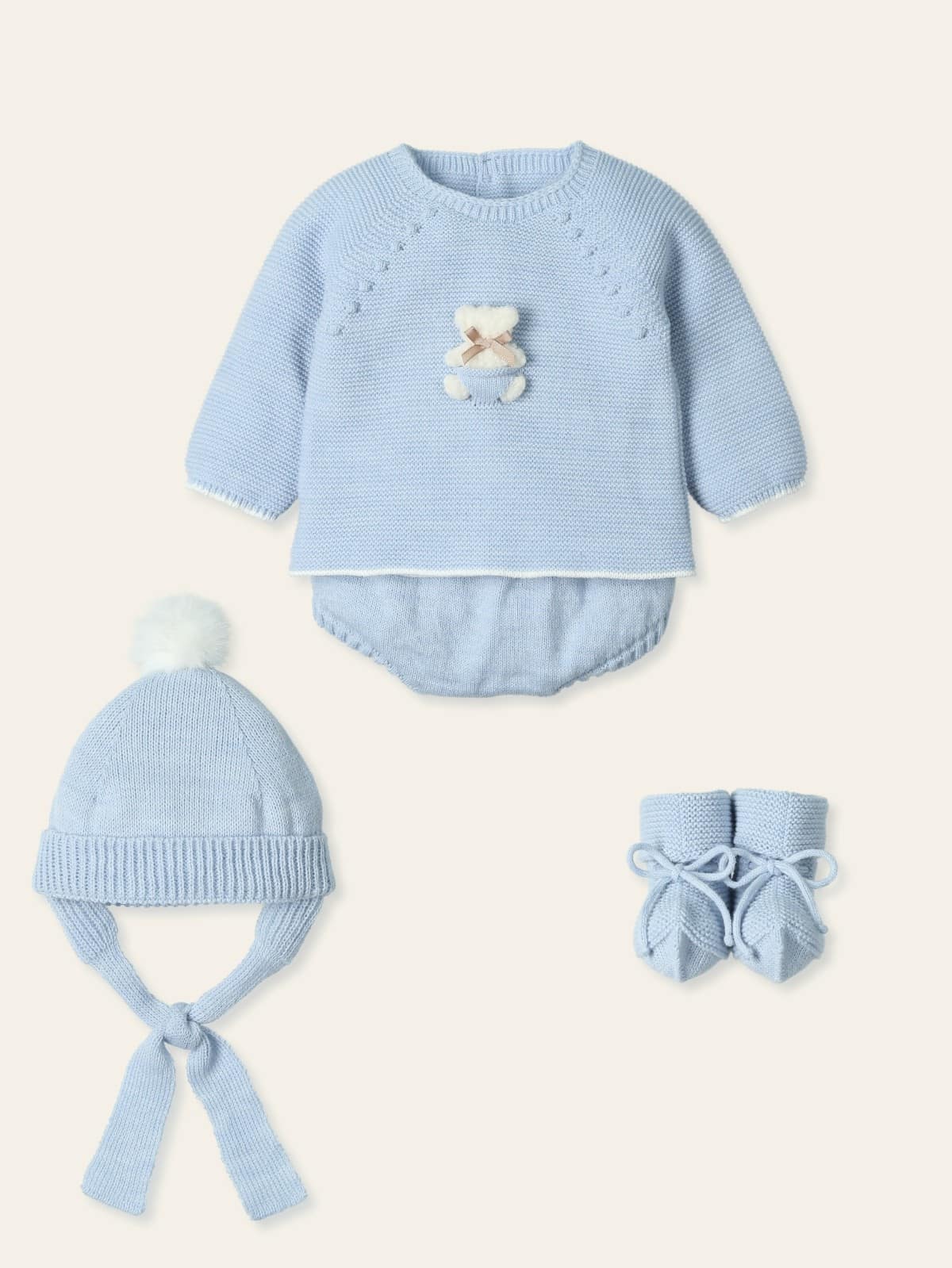 Conjunto ranita de lana (Dralón) en color azul empolvado con detalle bolsillo. El osito que lleva es decorativo y se puede quitar siempre que sea necesario.