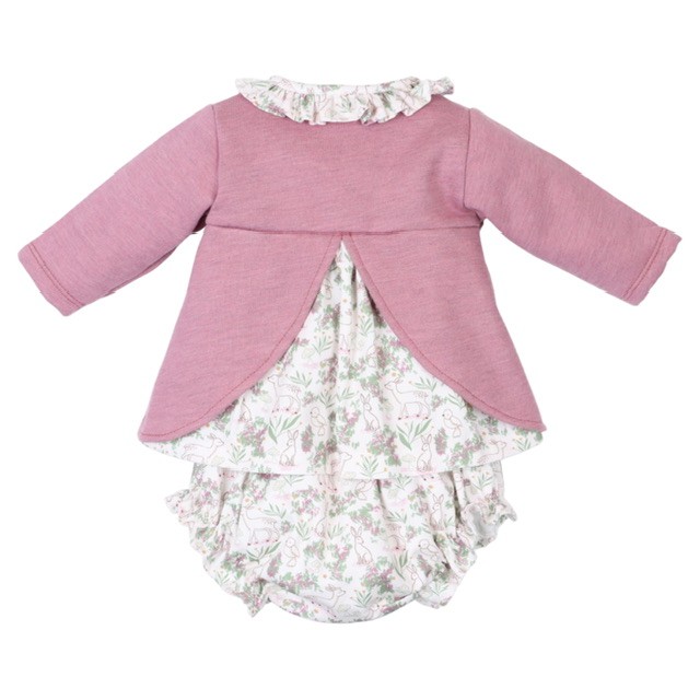 Sudadera 100% algodón con interior afelpado en color malva. Detalle volante en el cuello y apertura en la espalda con tejido estampado de flores.