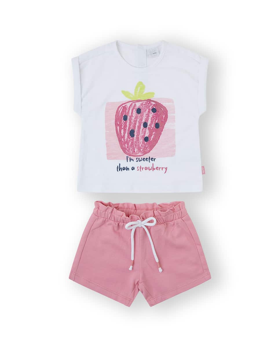 Camiseta 100% algodón de color blanco con estampado fresa en color rosa.