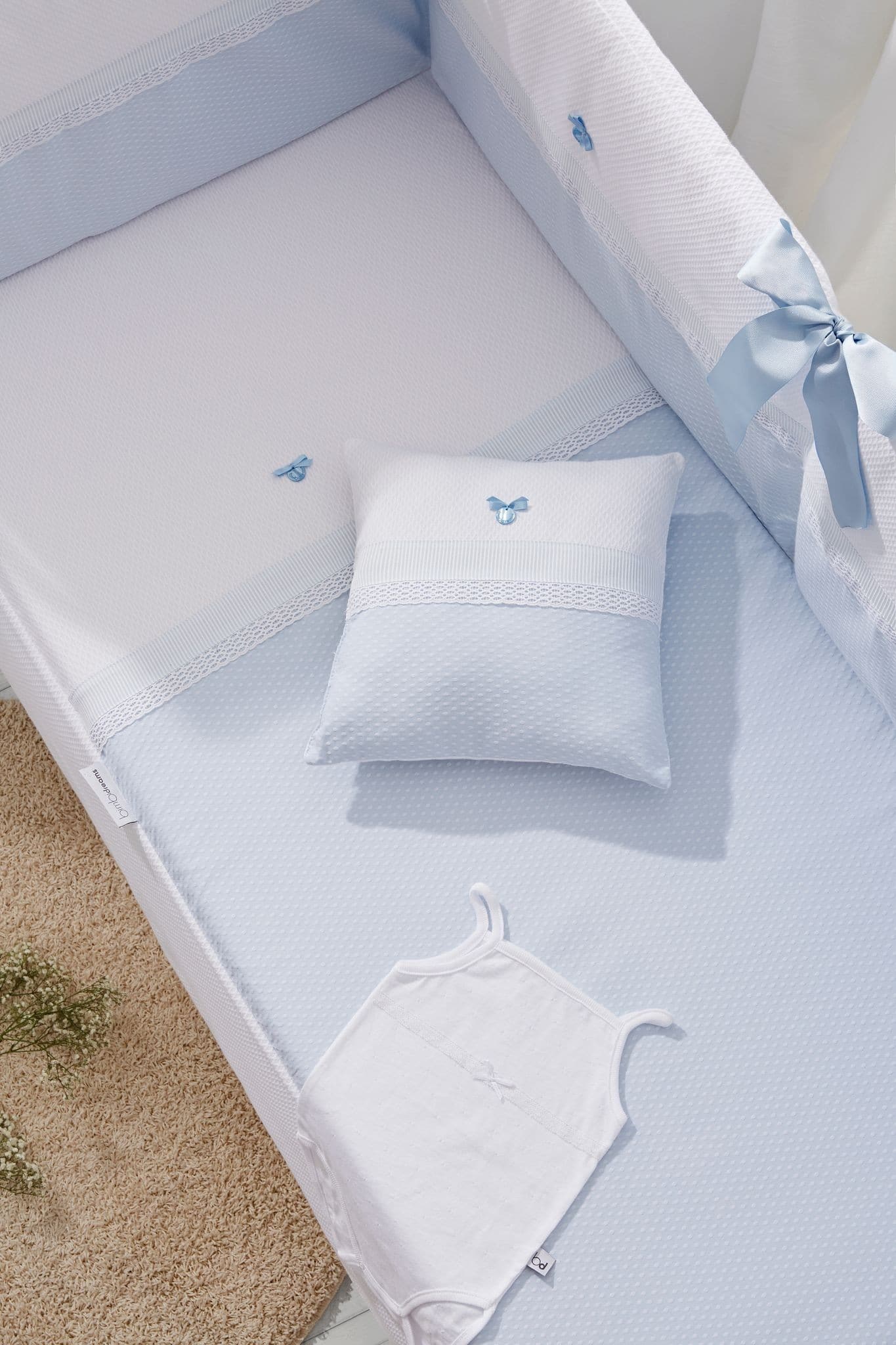 Protector en color blanco y azul celeste con detalle lazos de satén
