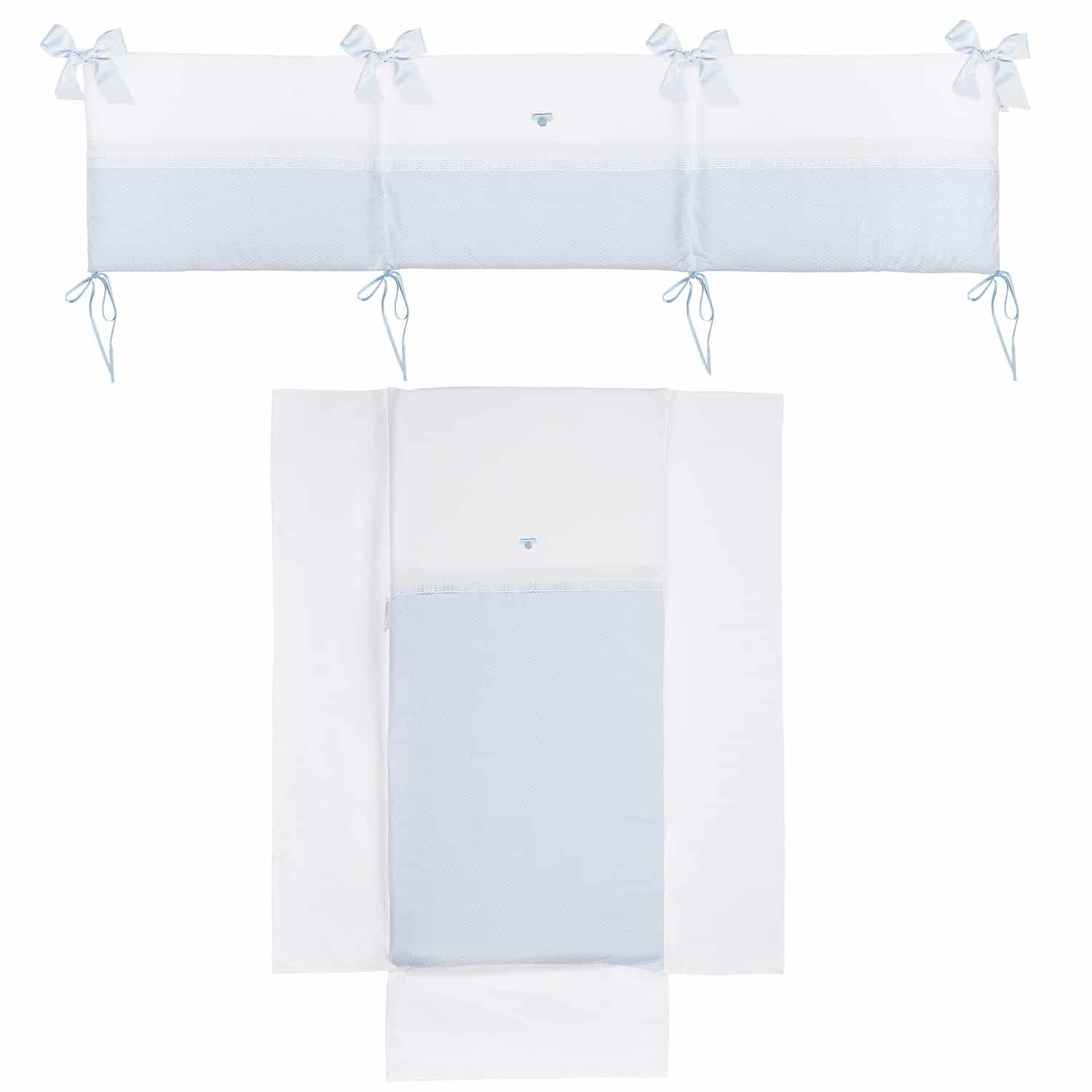 Edredón y protector para cuna maxicuna de la colección Venecia Celeste. De la marca BimbiDreams.
