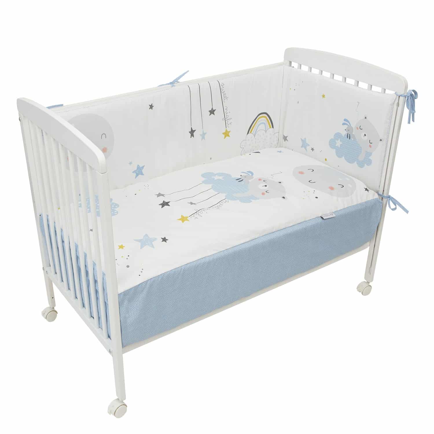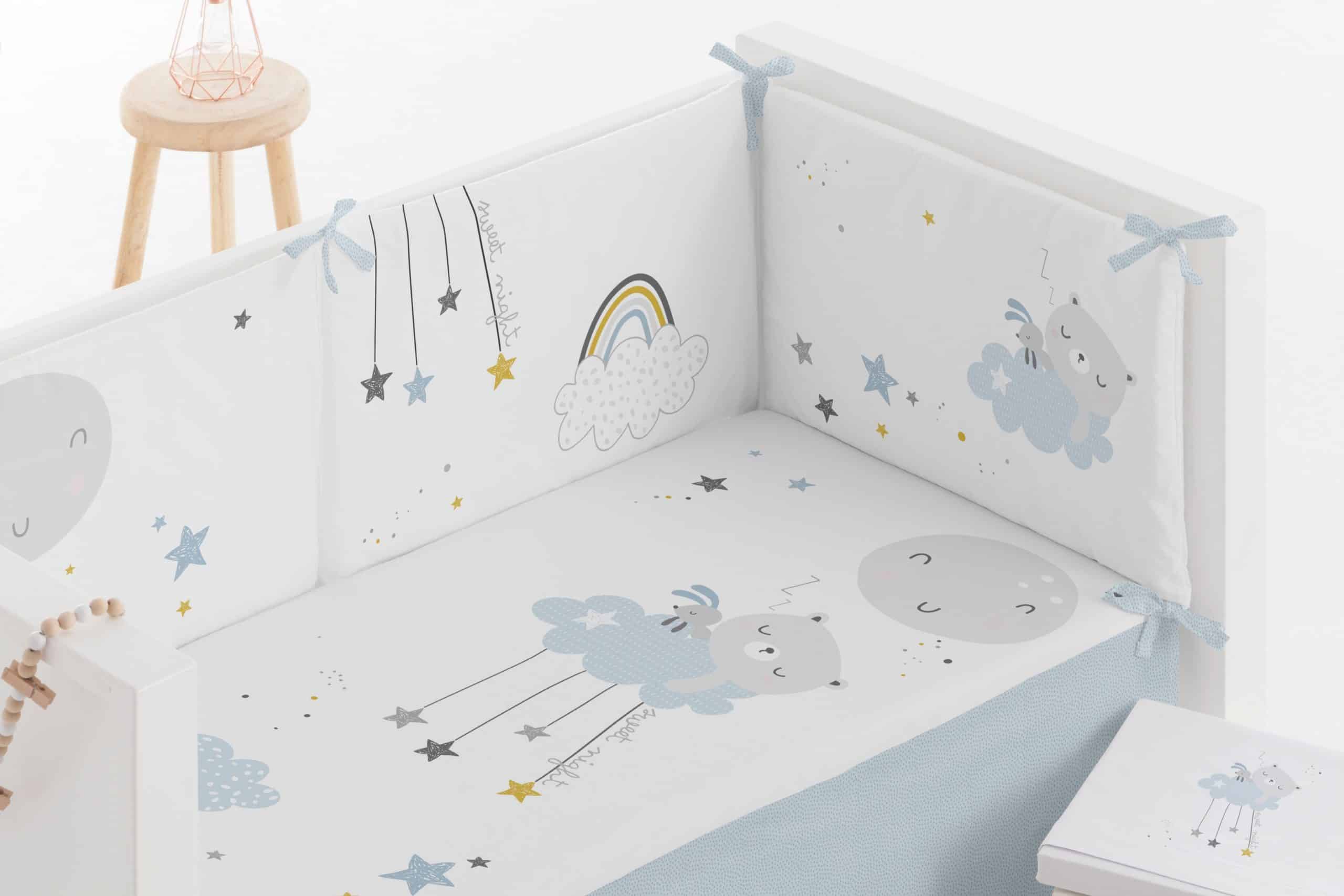 Edredón desenfundable de algodón 100% en color blanco con detalles en celeste y gris, perfecto para utilizarlo en verano quitando el relleno y dejando solo la colcha.