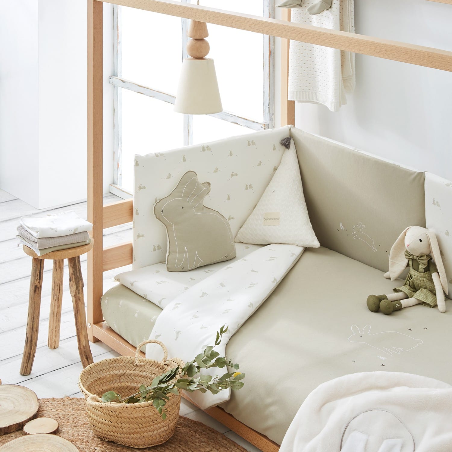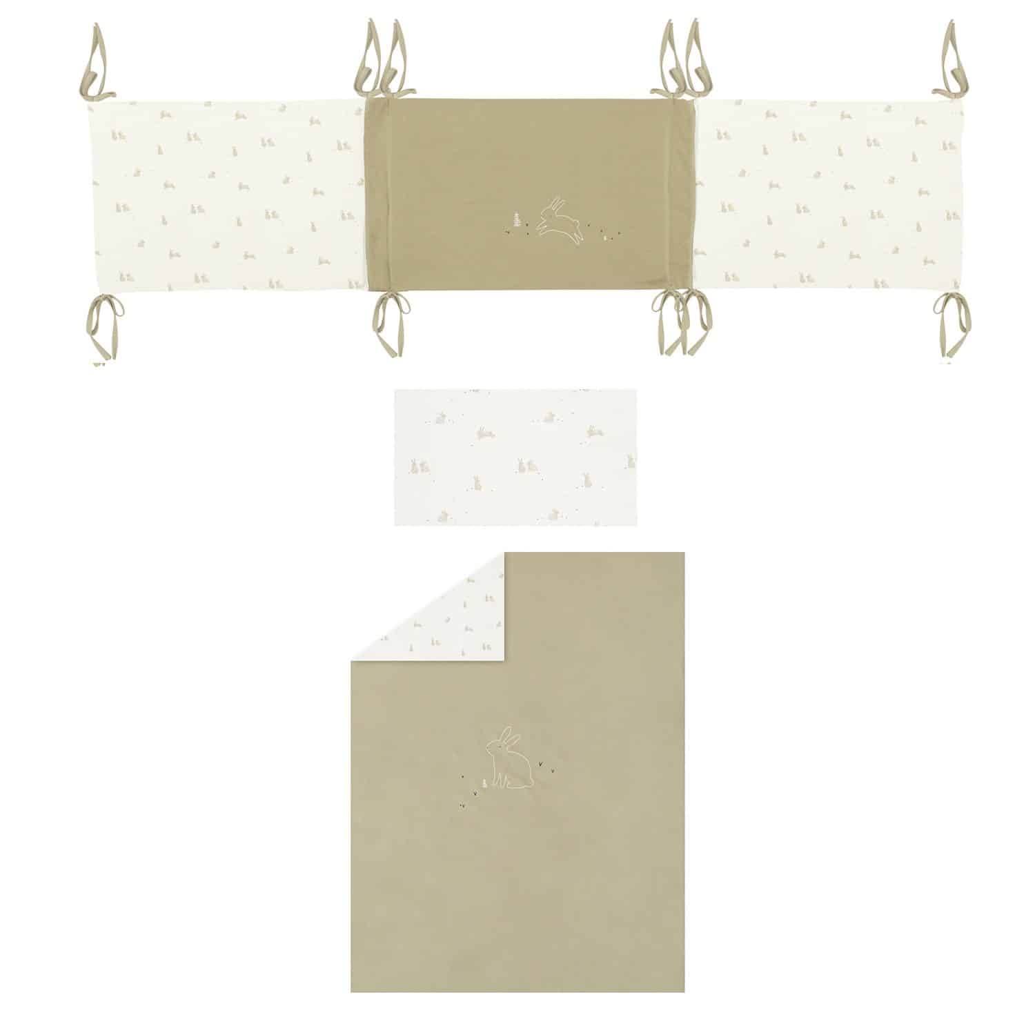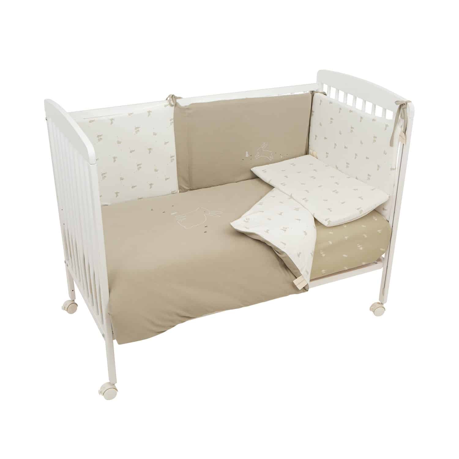 Funda nórdica de color musgo con estampado de conejitos.