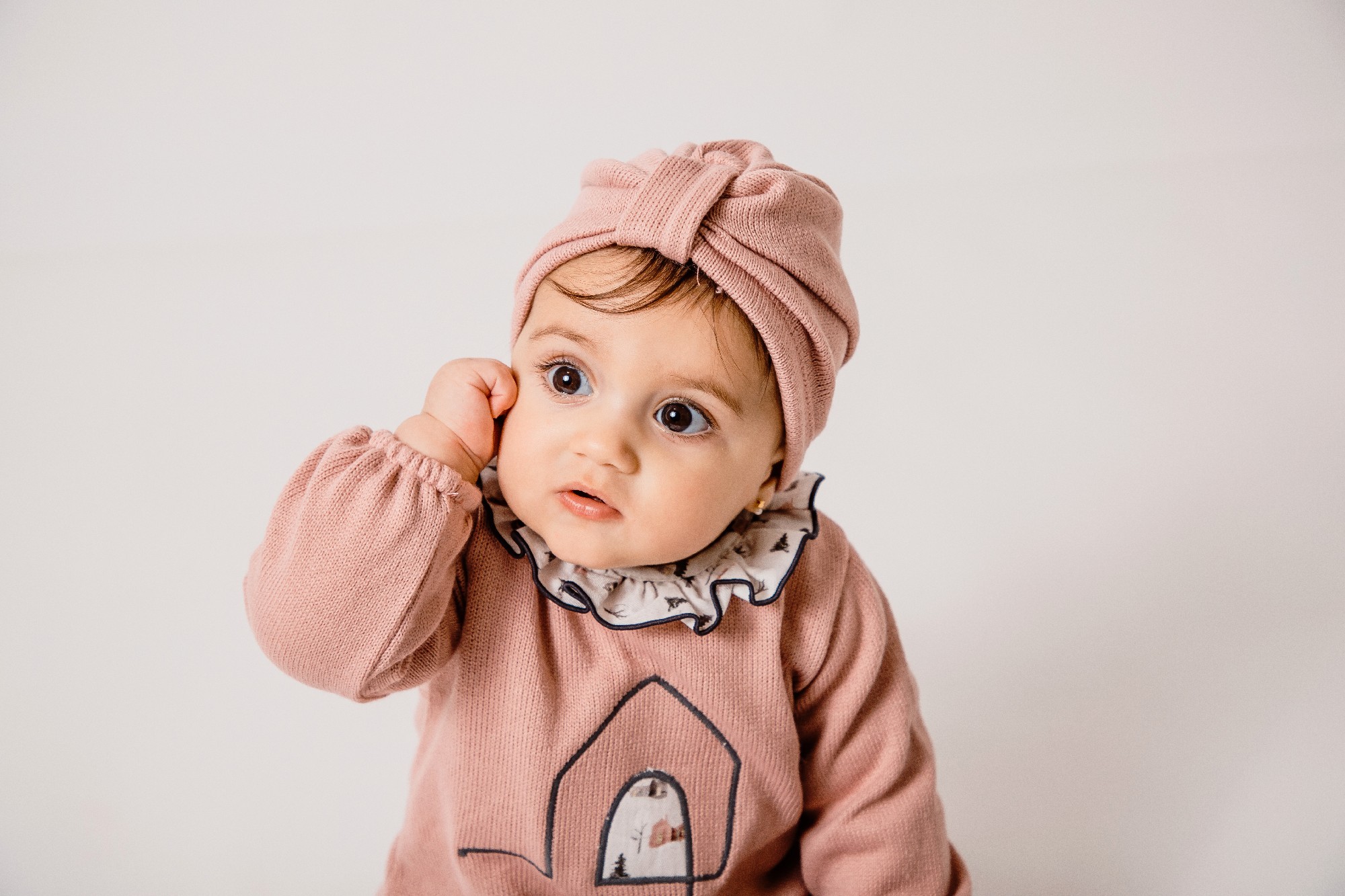 Gorrito bebé de algodón cálido disponible en tres colores: Rosa Empolvado, Azul Francia y Gris.