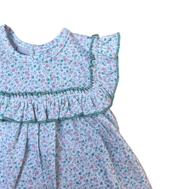 Jesusito 100% punto de algodón con estampado de flores en azul celeste. Detalle volantes en el pecho