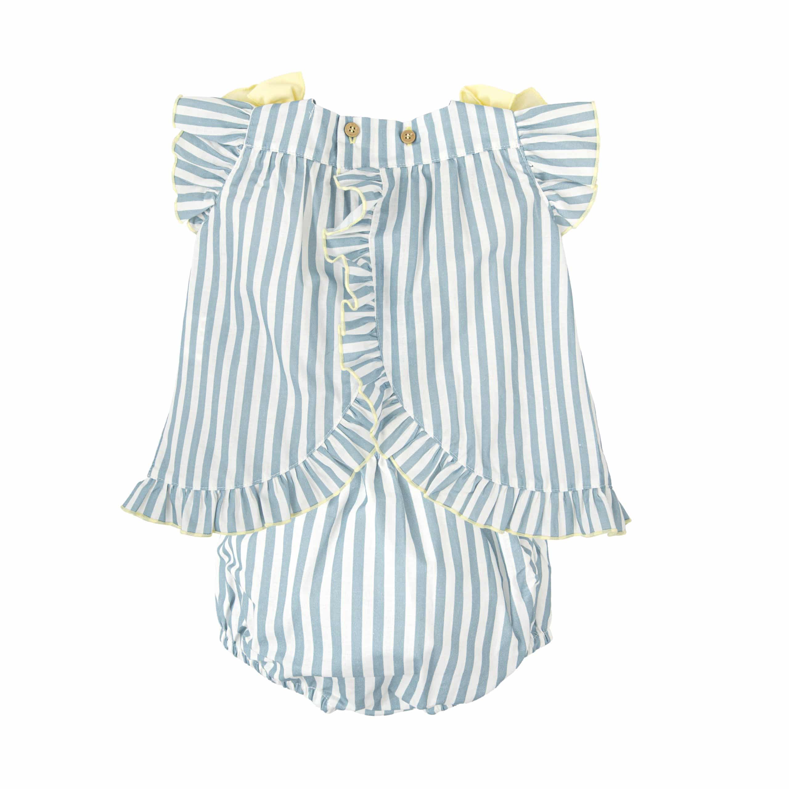 Detalle fruncido en el pecho y volantes en las mangas. Lacitos decorativos en color amarillo pastel.