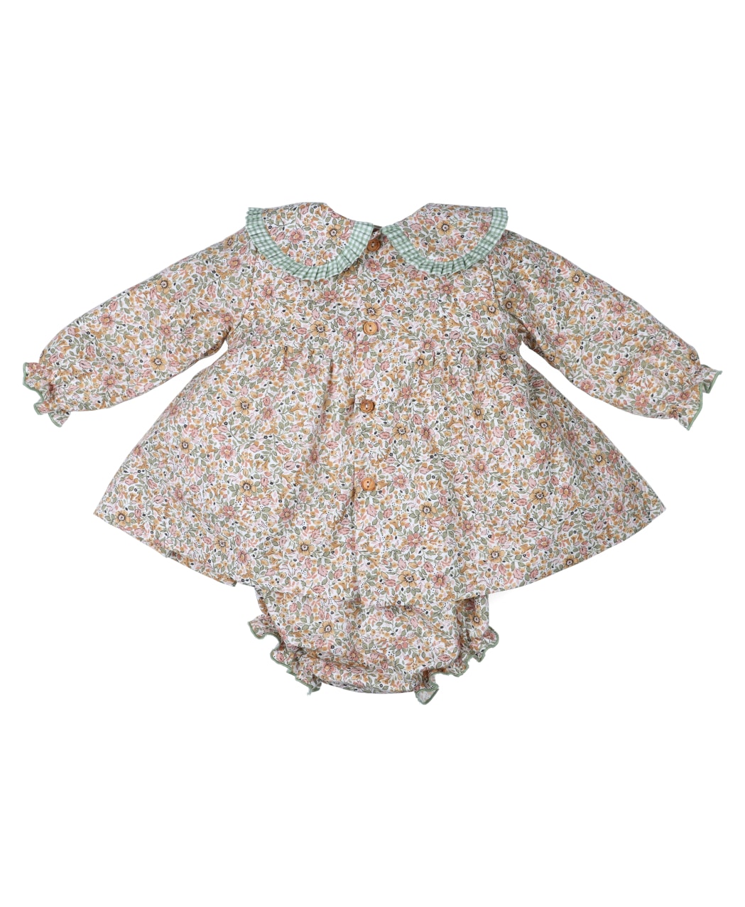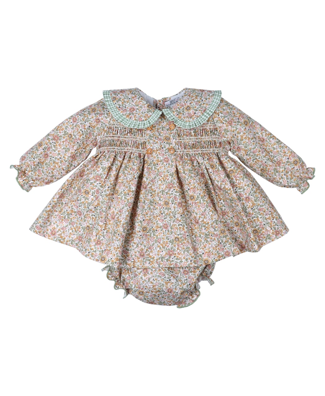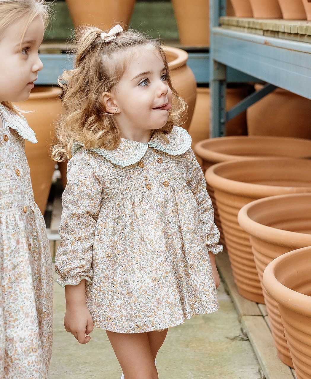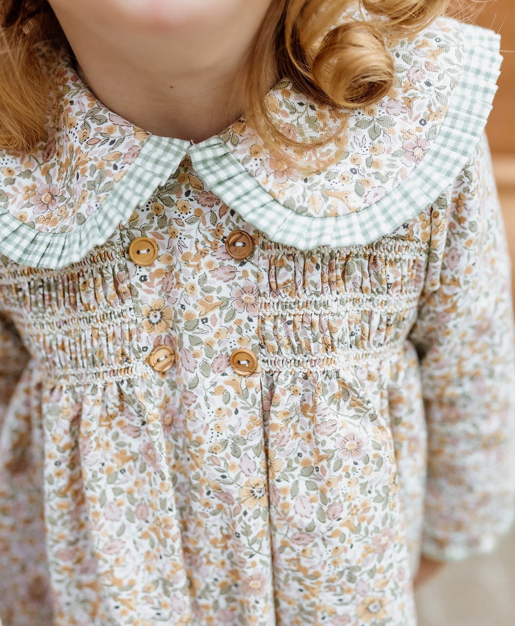 Jesusito con estampado de florecitas en tonos otoñales. Detalle nido de abeja en el pecho y cuello babero con tejido de cuadritos vichy en verde.