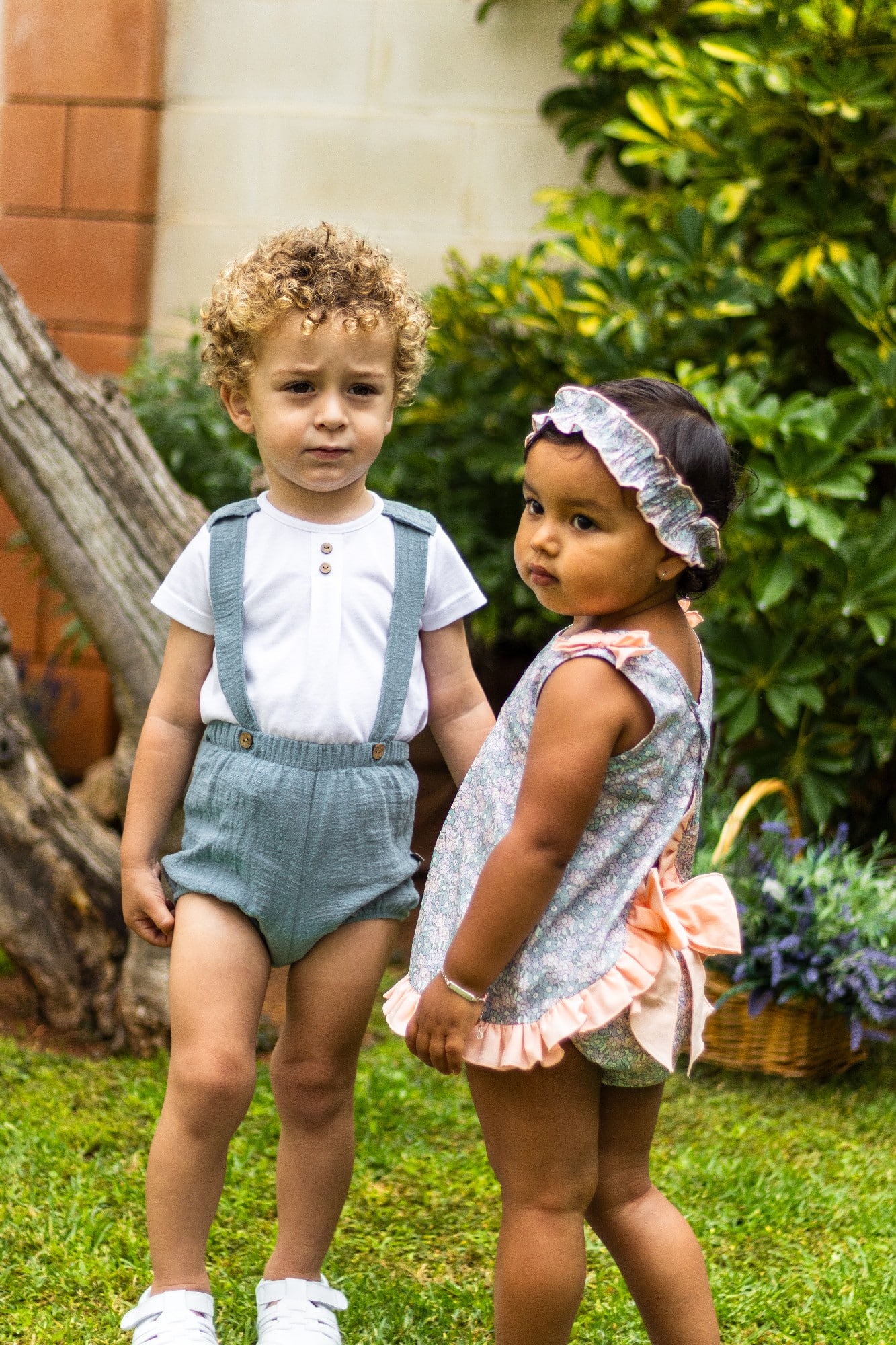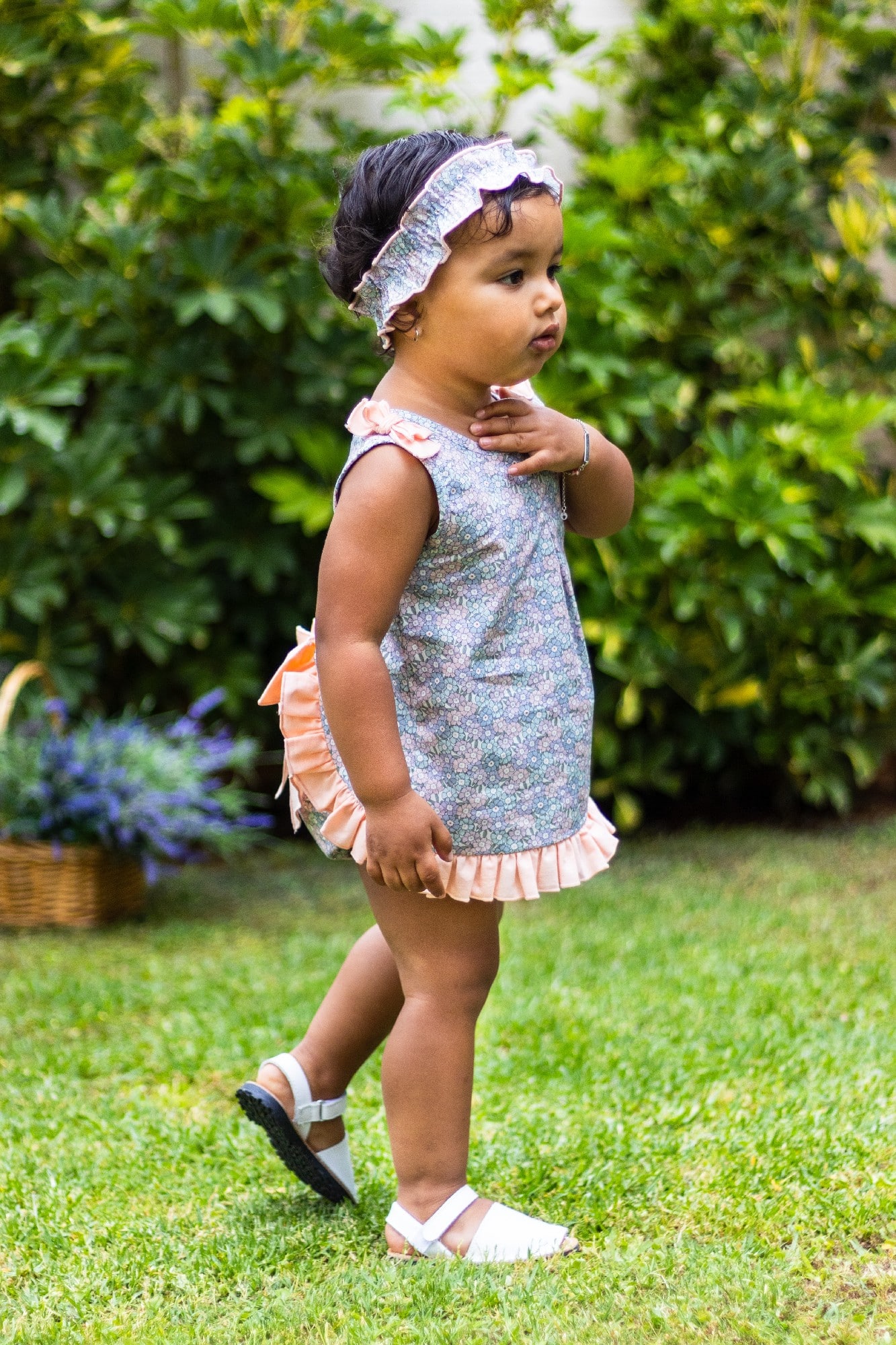 Jesusito con estampado de flores en color azul empolvado y salmón.