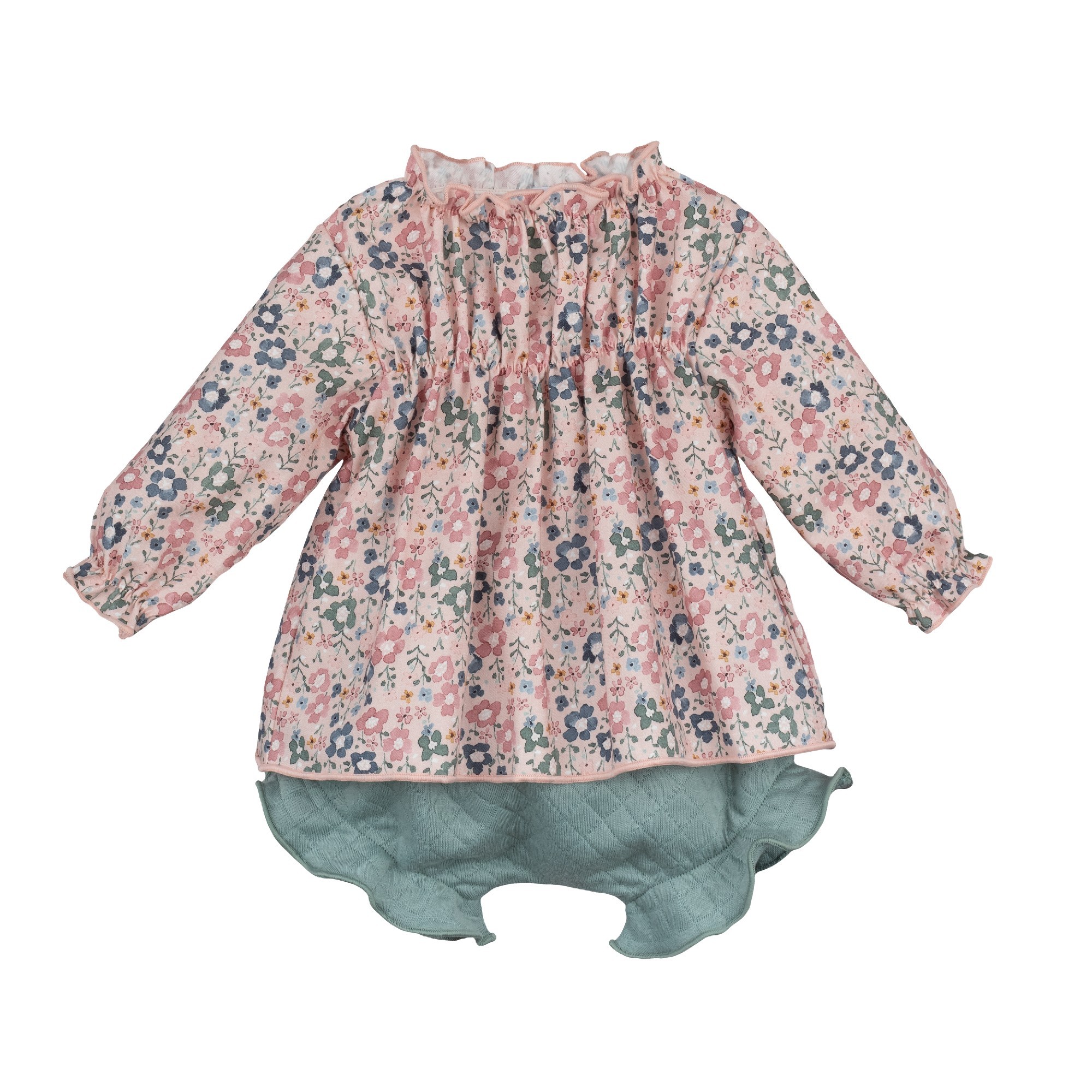 Camisa 100% algodón de color rosa con estampado de flores. Detalle engomado y volante en el cuello.