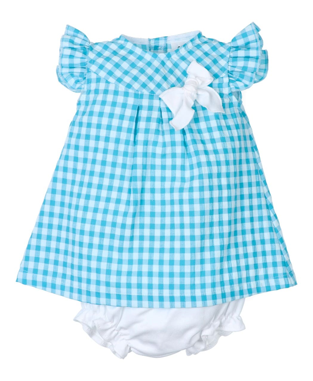 Vestido con estampado de cuadro vichy en color turquesa y blanco. Detalle lazo en el pecho y volantes
