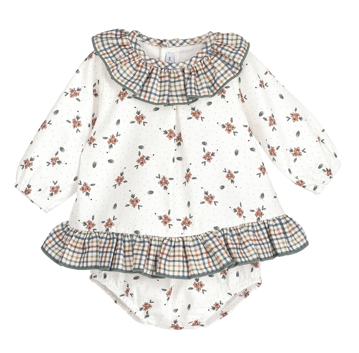 Jesusito de color blanco con estampado de flores en color salmón. Detalle volantes con estampado de cuadros en arena.