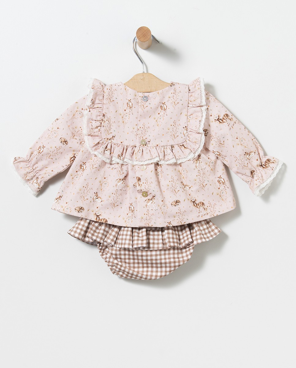 Jesusito de color rosa empolvado con estampado de cervatillos en marrón.