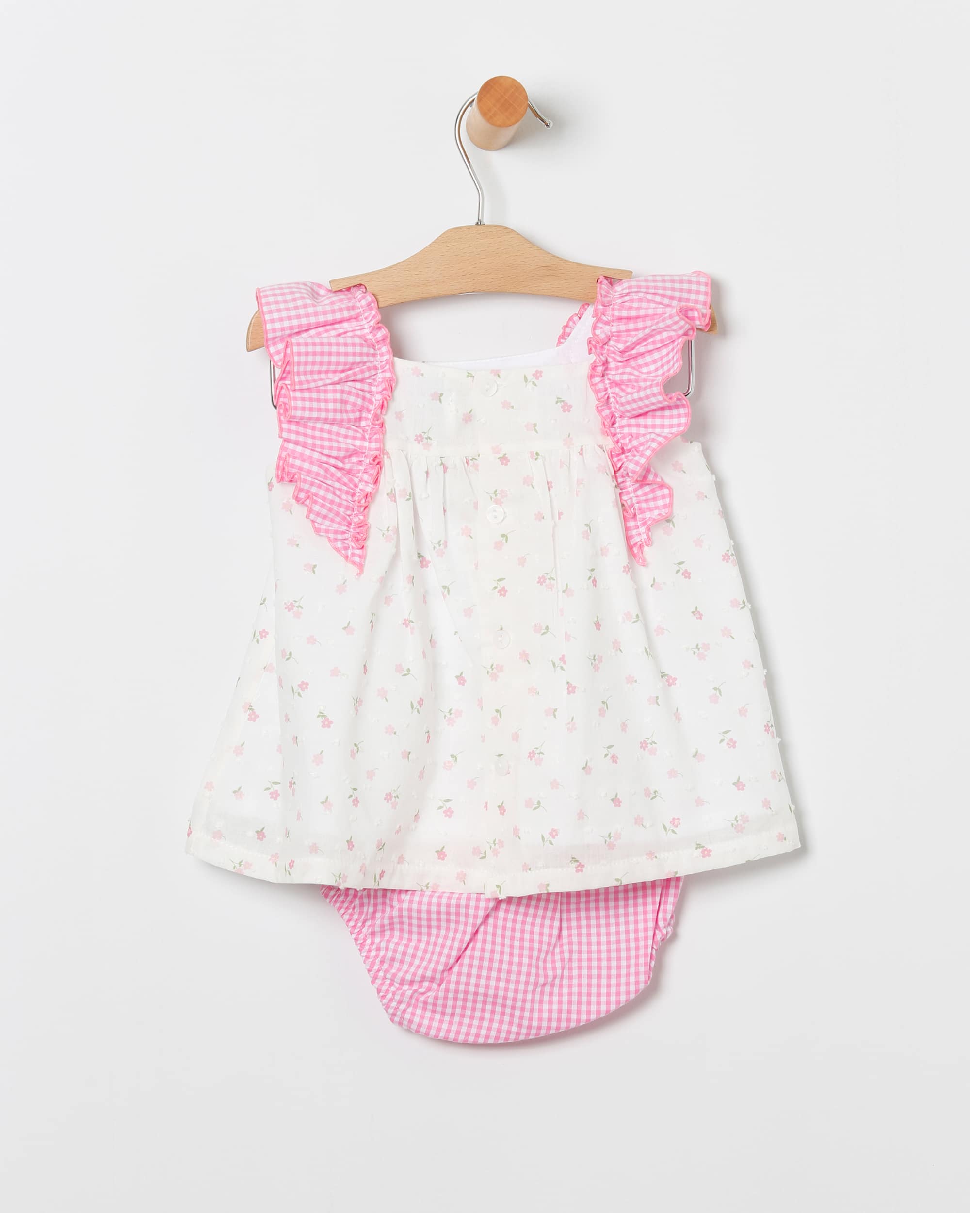 Jesusito tejido plumeti de color blanco con estampado de flores en color rosa.
