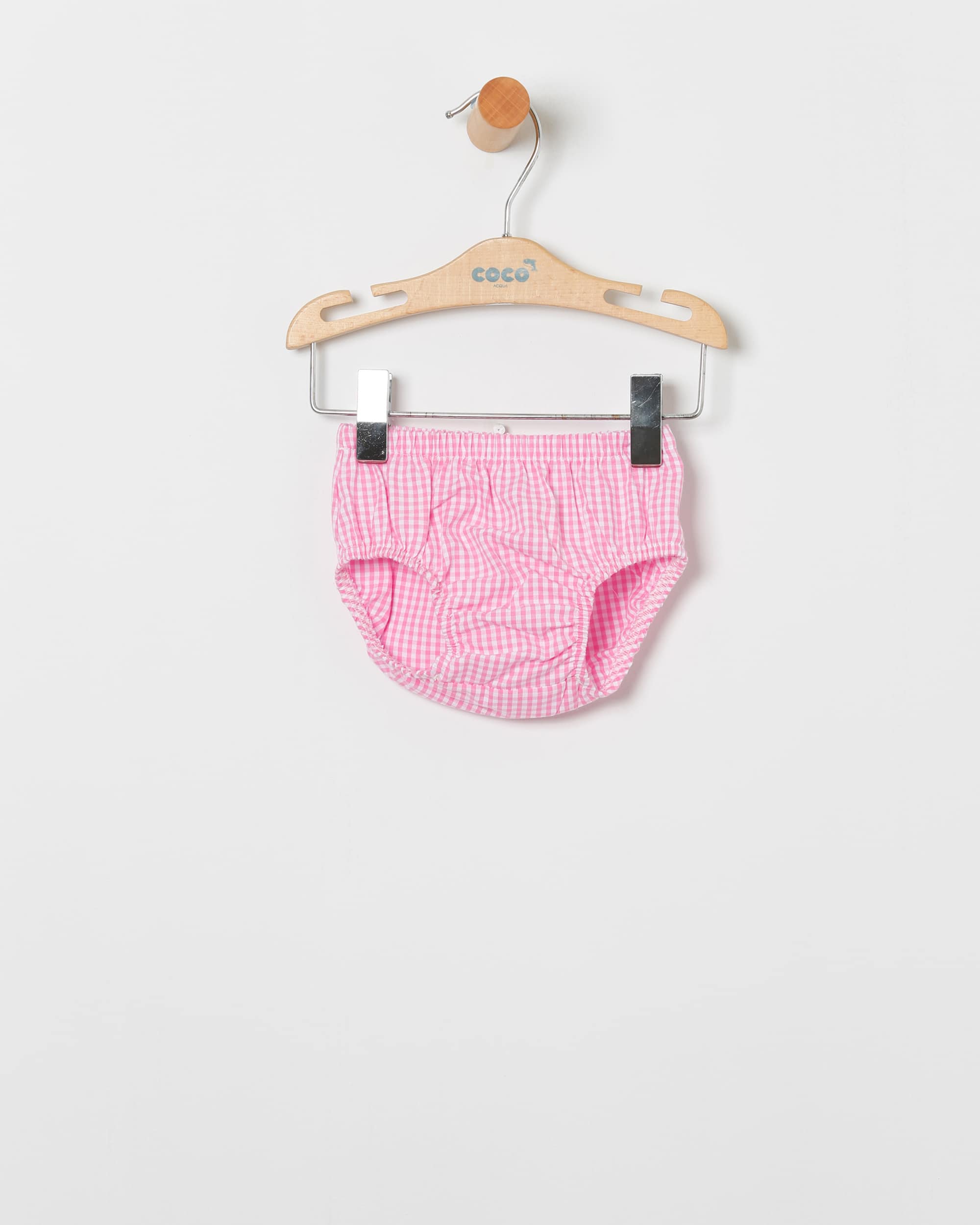 Detalle volantes en las mangas con estampado de cuadro vichy en rosa.