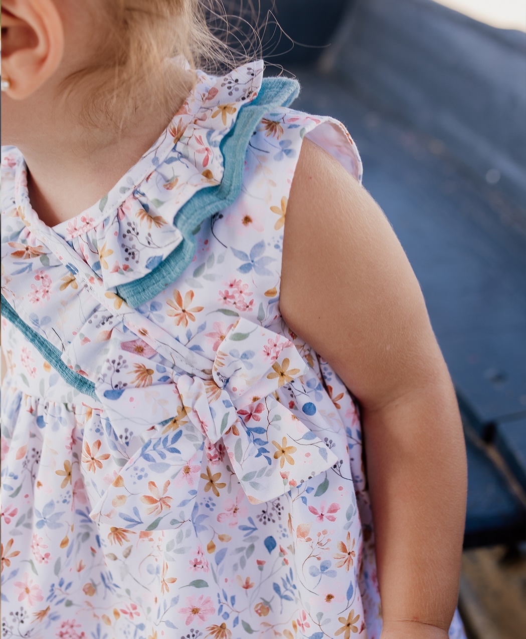 Detalle volantes cruzados en el pecho y lacito.