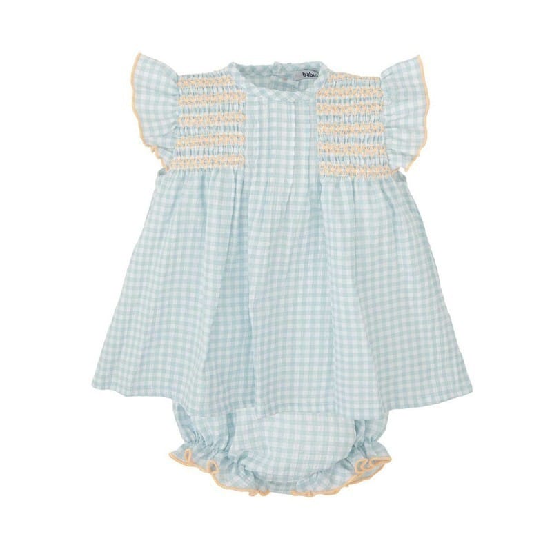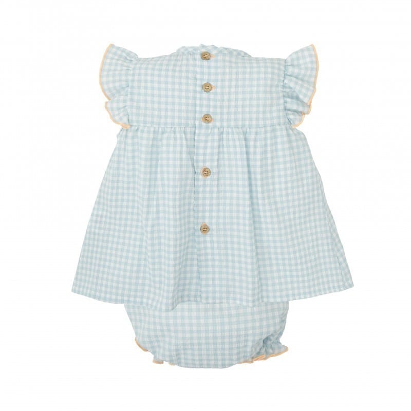 Jesusito 100% algodón con estampado de cuadro vichy en azul turquesa y blanco. Detalle nido de abeja en color naranja neón y volantes en los hombros.