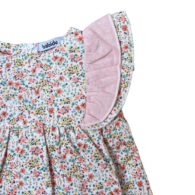 Jesusito 100% algodón con estampado de flores en color rosa. Detalle doble volante en los hombros.