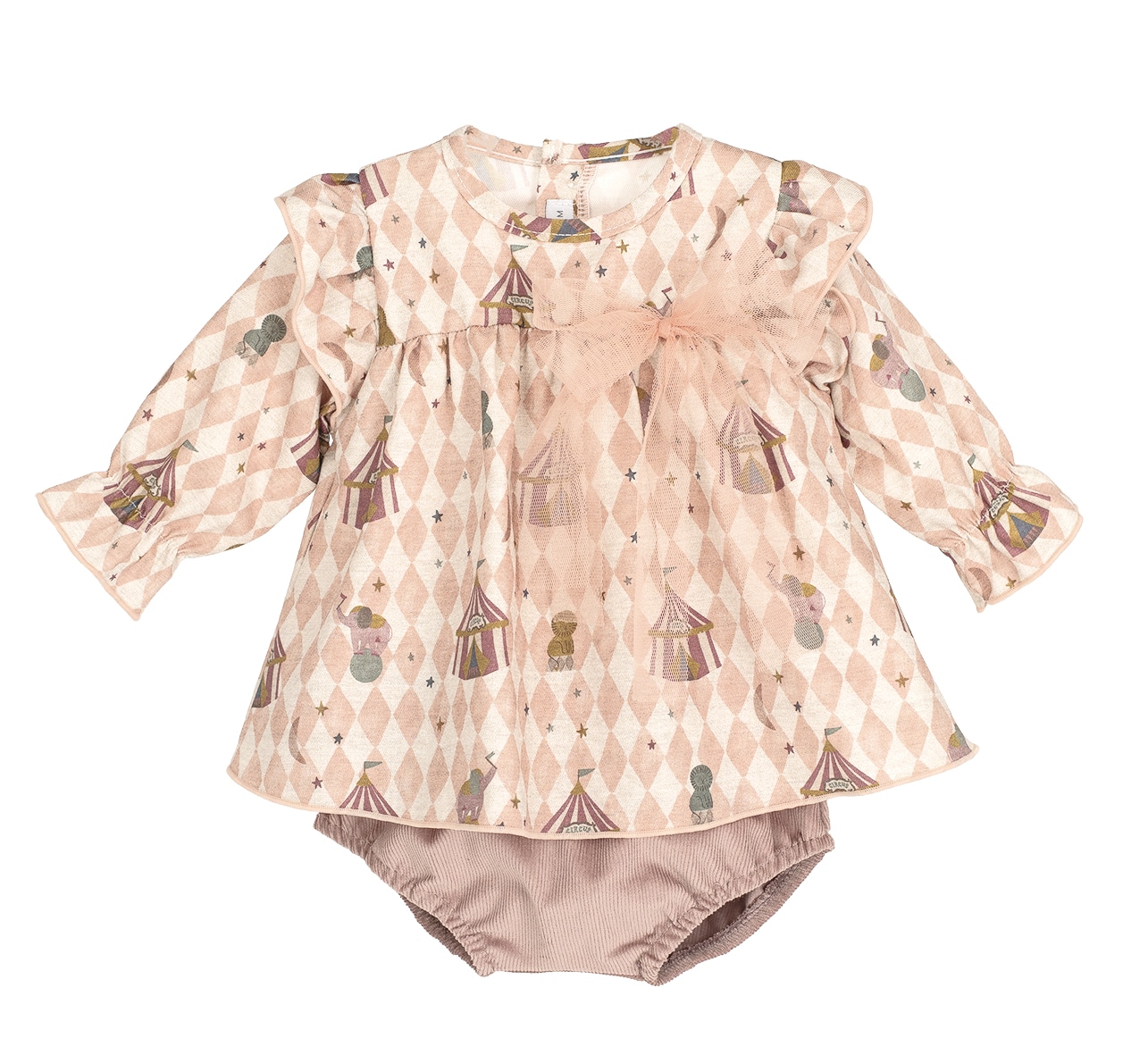 Jesusito en tonos rosa empolvado con estampado circo. Detalle volantes en el pecho y lazo de gasa.