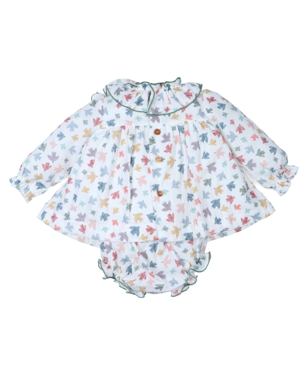 Jesusito de bambula en color blanco con estampado de pájaros en colores.