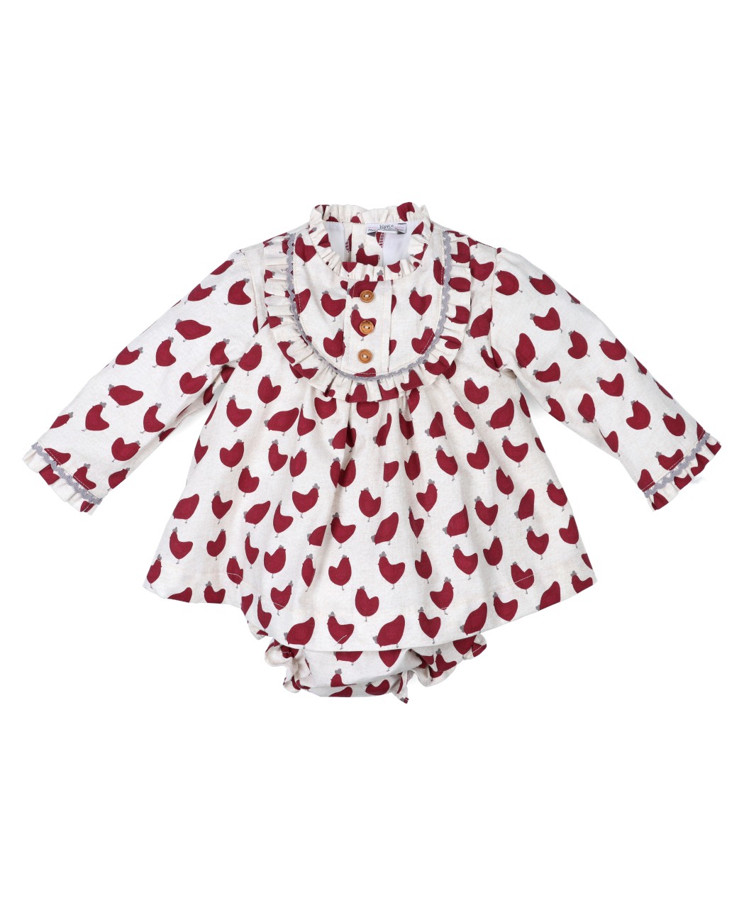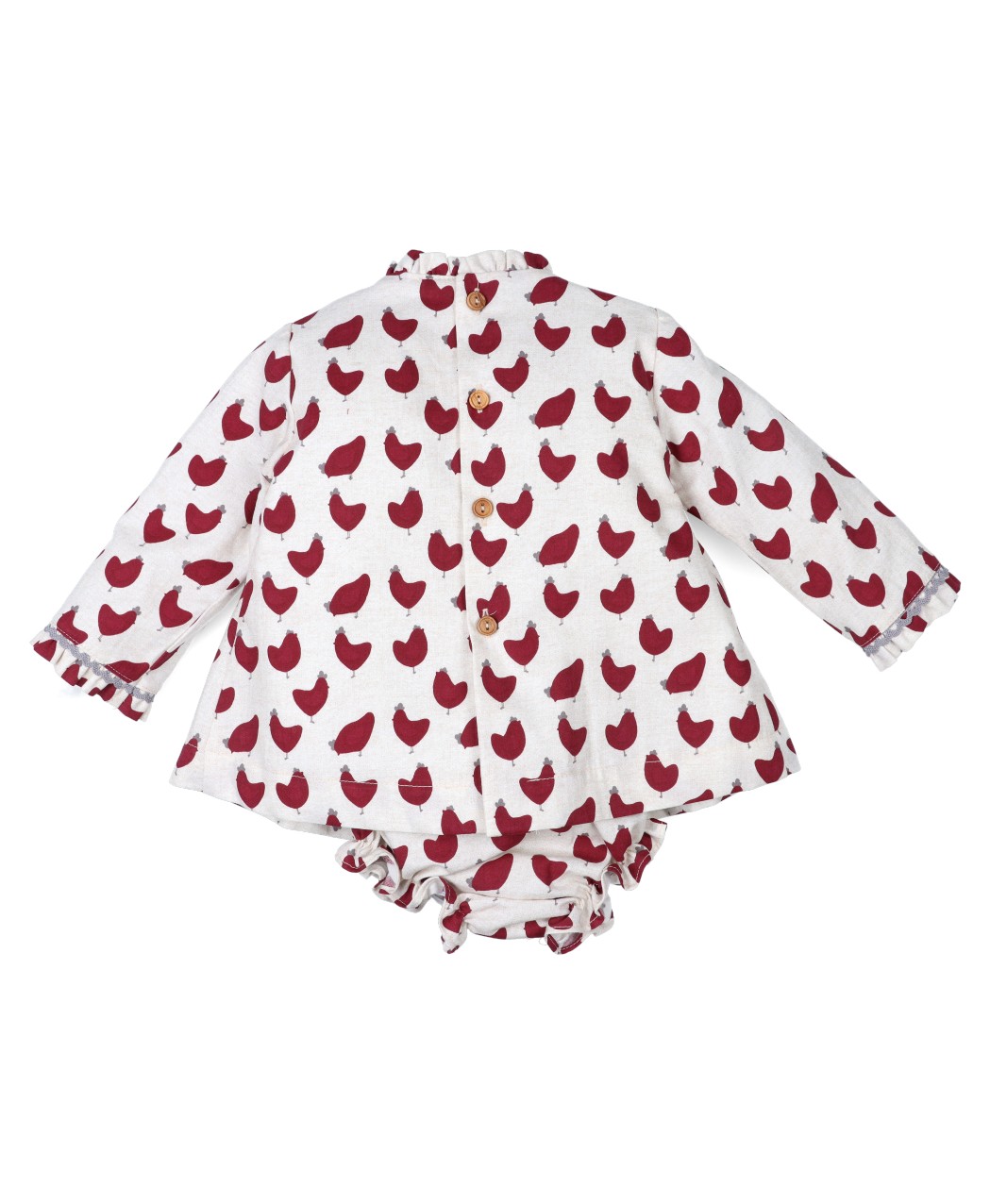 Jesusito de color lino, con estampado en tonos granates. Detalle volantes en el pecho y cuello y botones de madera decorativos.