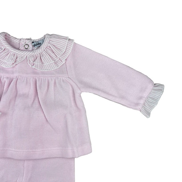 Conjunto 100% algodón con interior afelpado en color rosa bebé y detalles en tejido estampado de rayas. Cuello y puños con volante.