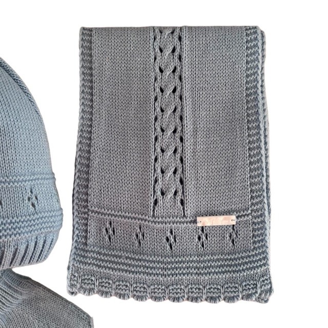 Conjunto de gorro, manopla y bufanda en color azul nube.