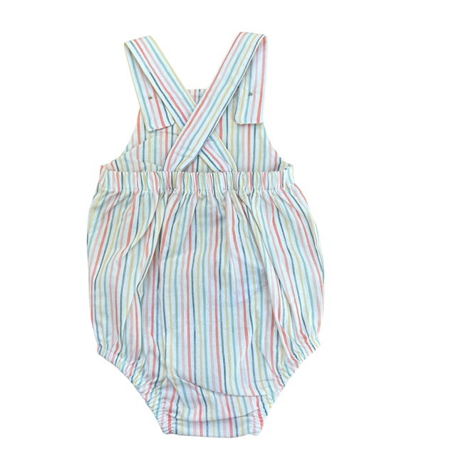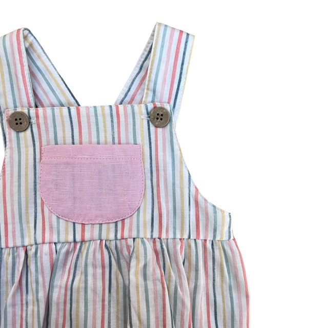 Pelele 100% algodón con estampado de rayas de colores. Detalle bolsillo en la parte delantera.