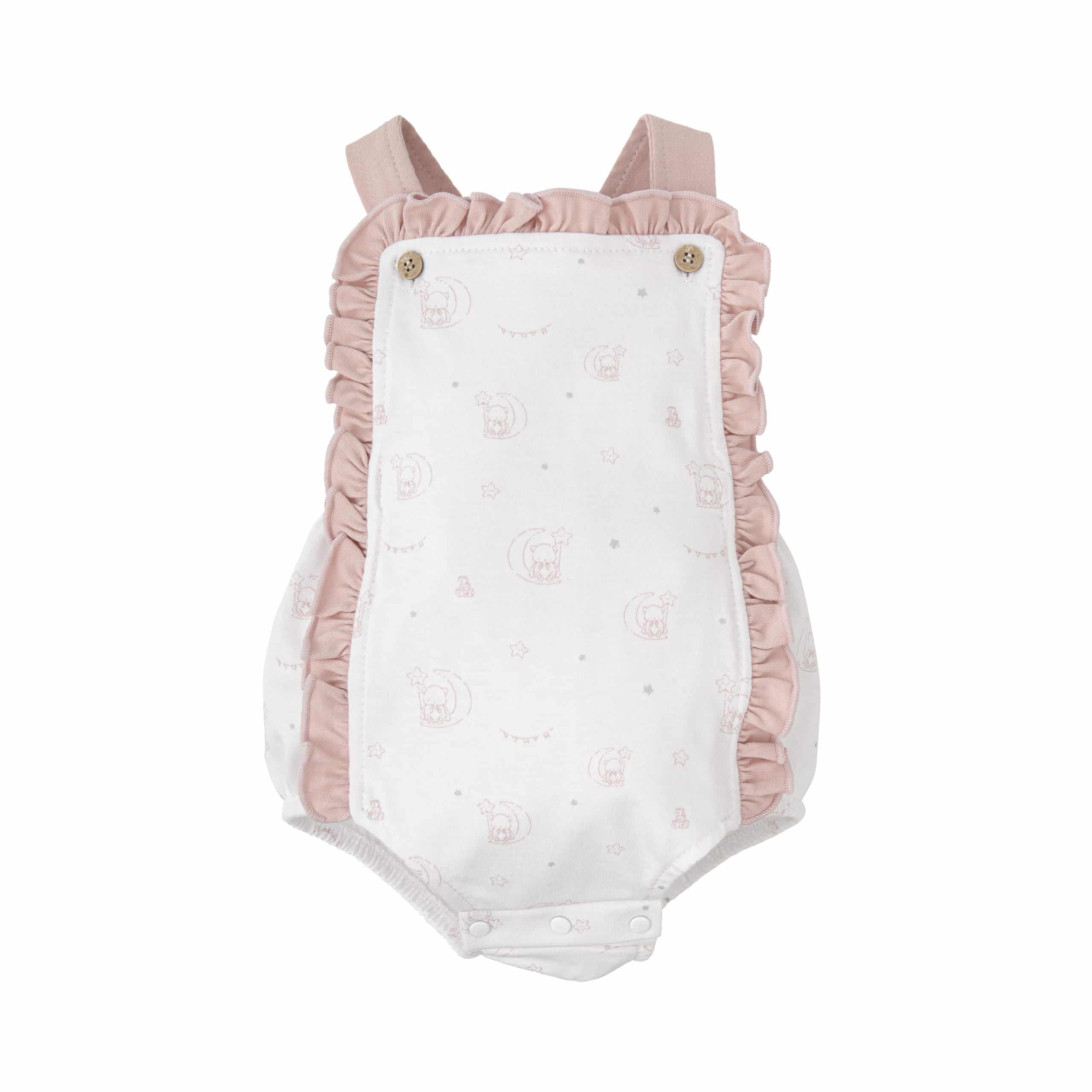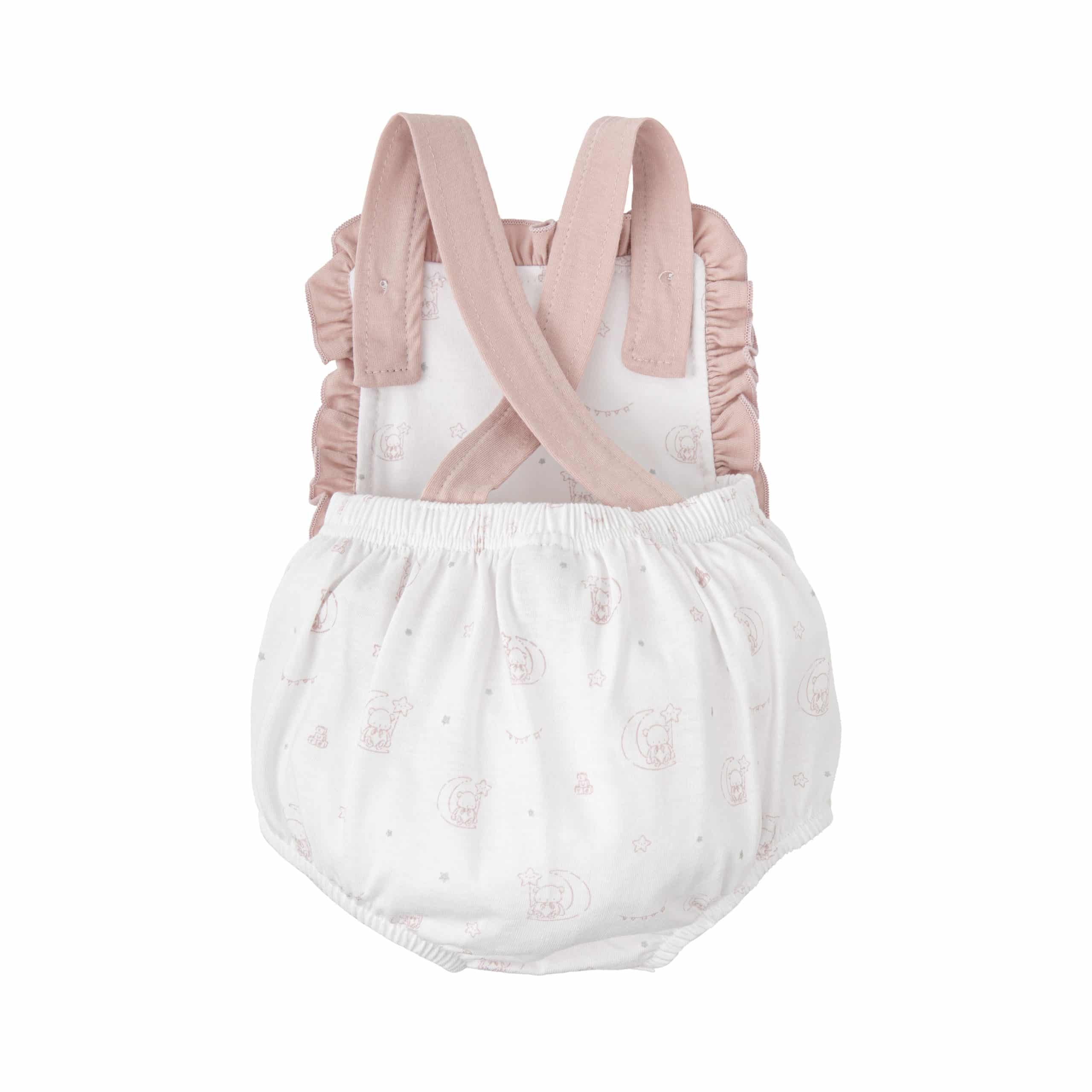 Pelele tirantes en algodón 100% de color blanco y rosa empolvado. Detalle volantes en el pecho.