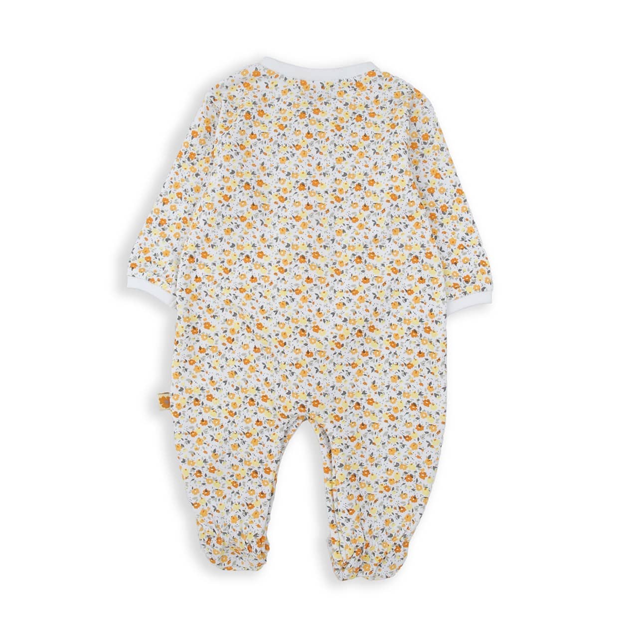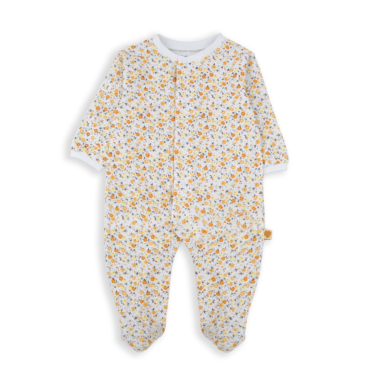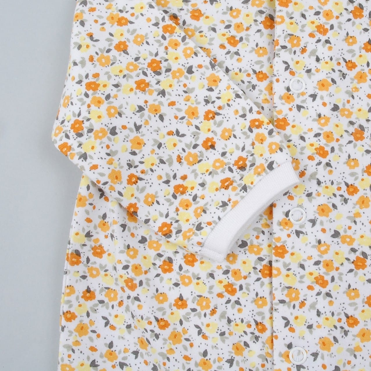 Pelele 100% algodón con estampado de flores de color naranja. Apertura completa con corchetes automáticos en la parte delantera e inferior.