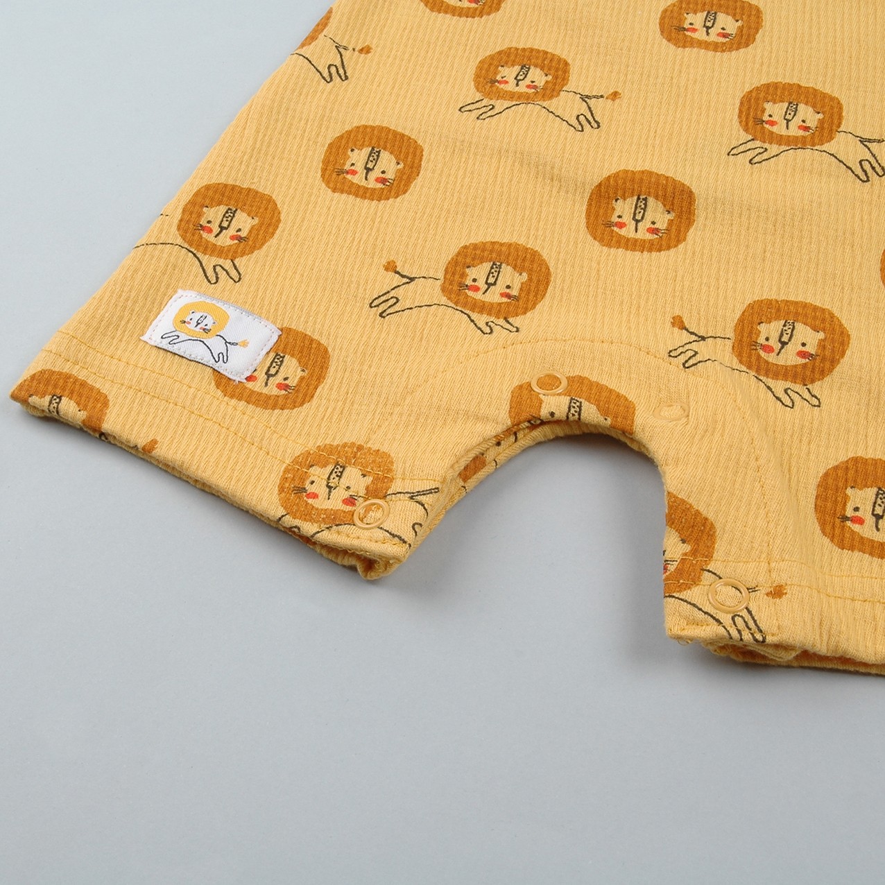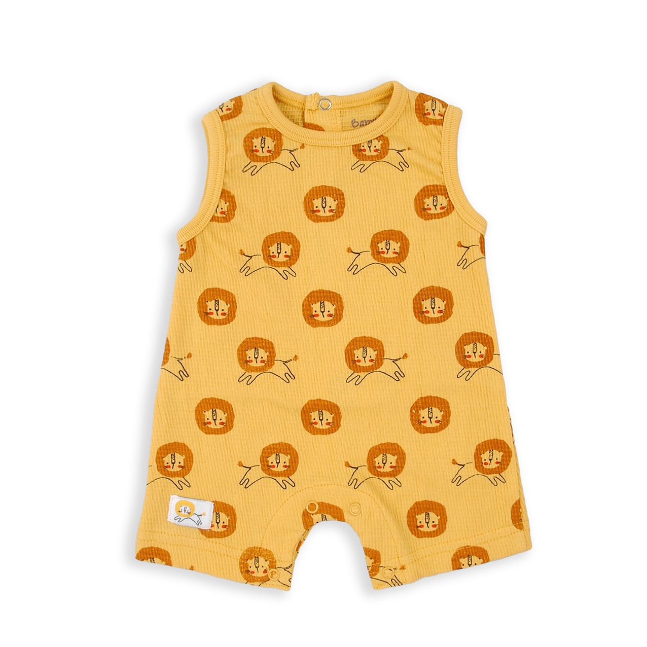 Pelele 100% algodón de tirantes con estampado leones en color mostaza. Apertura completa con corchetes automáticos en la parte trasera e inferior.