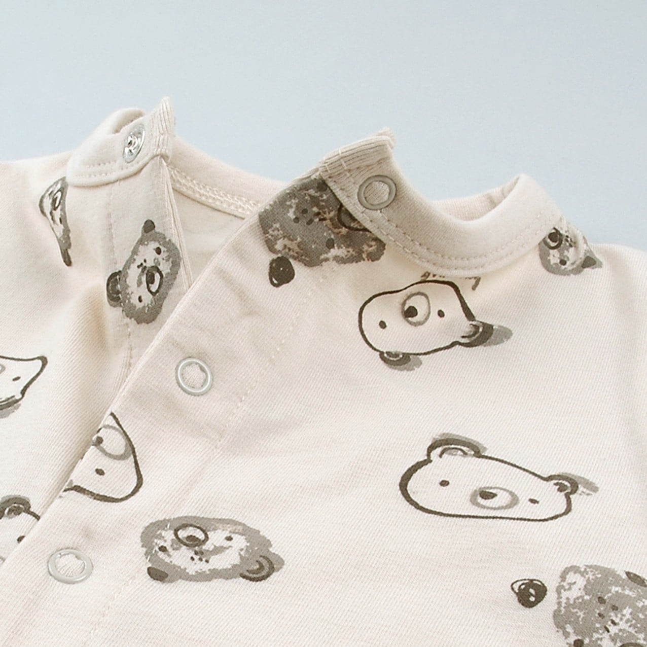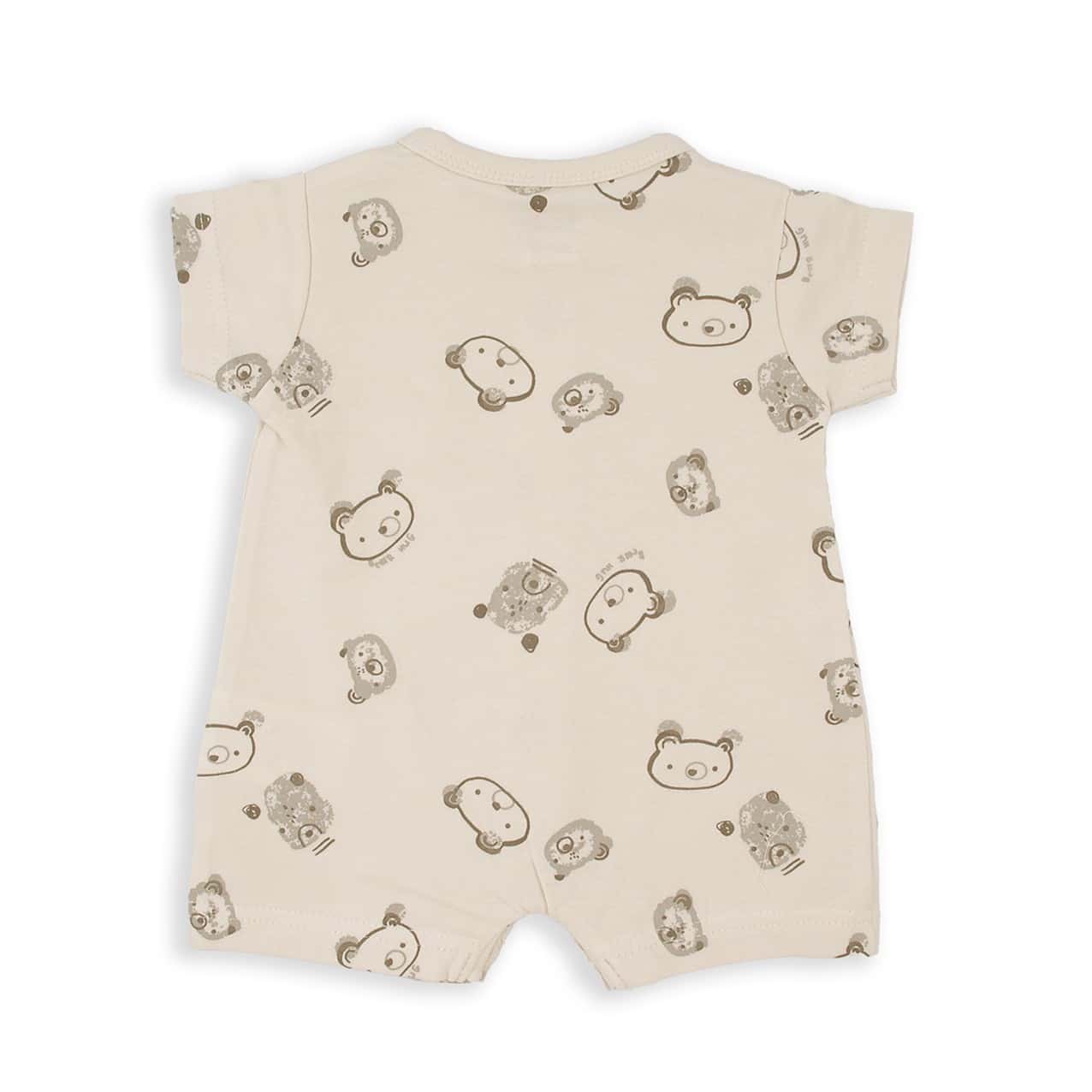 Pelele 100% algodón de manga corta con estampado de ositos en color beig. Apertura completa con corchetes automáticos en la parte delantera e inferior.