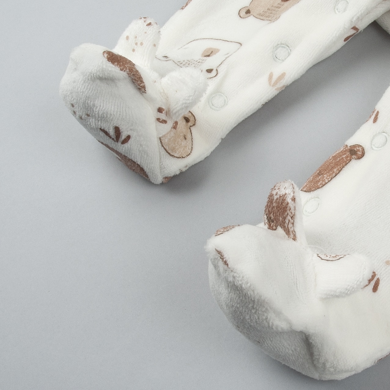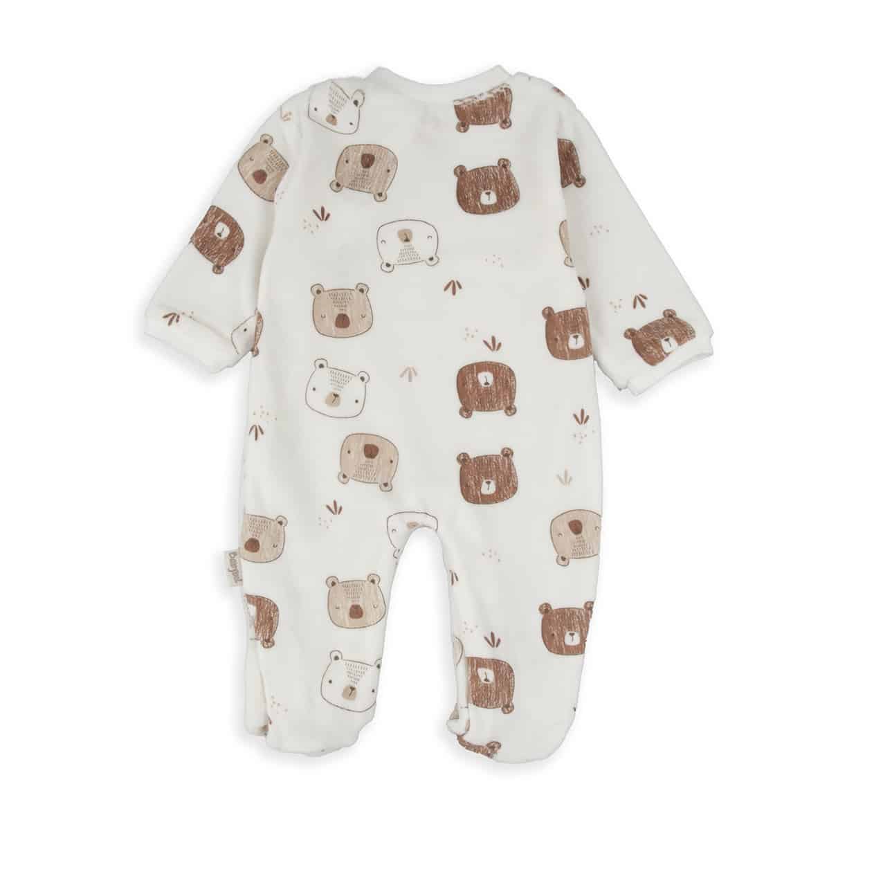 Pelele de terciopelo 100% algodón en color beige con estampado de ositos marrones.